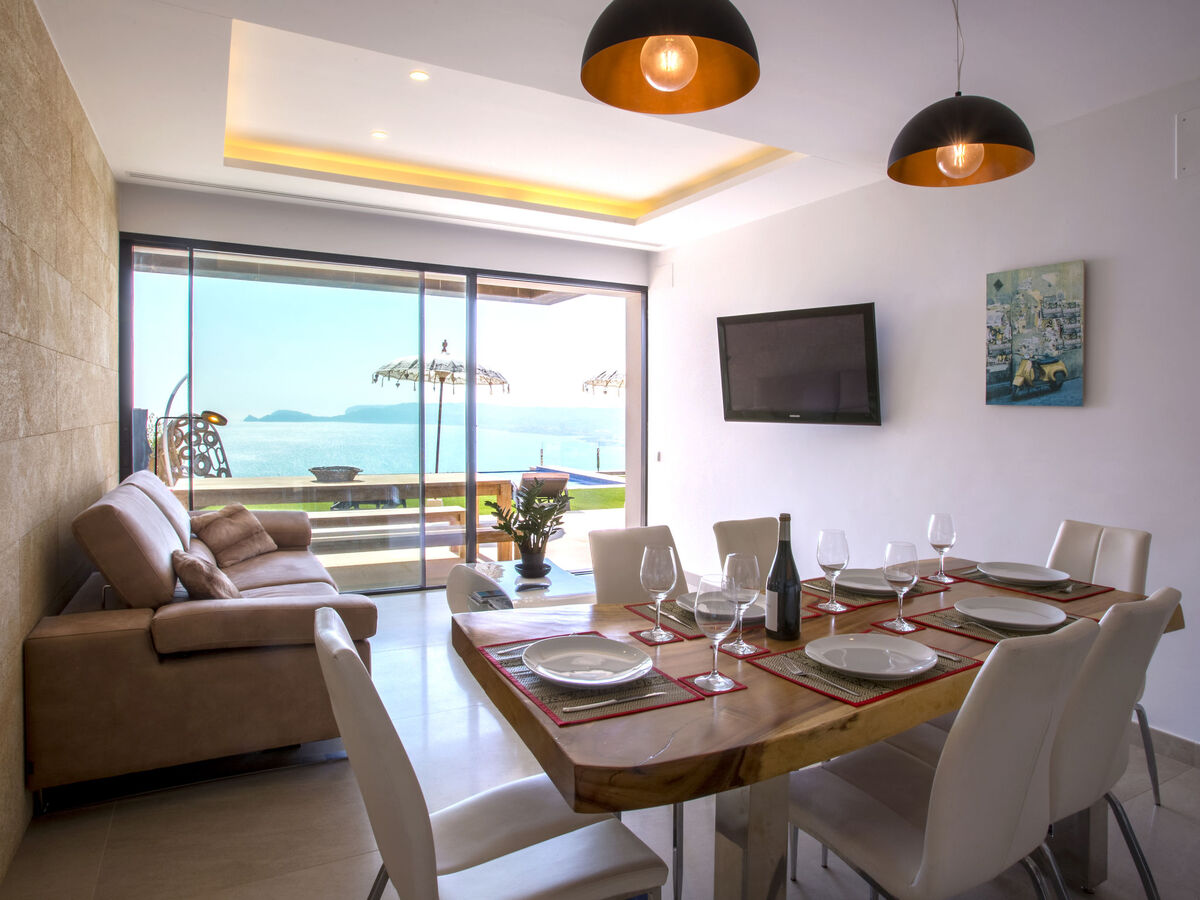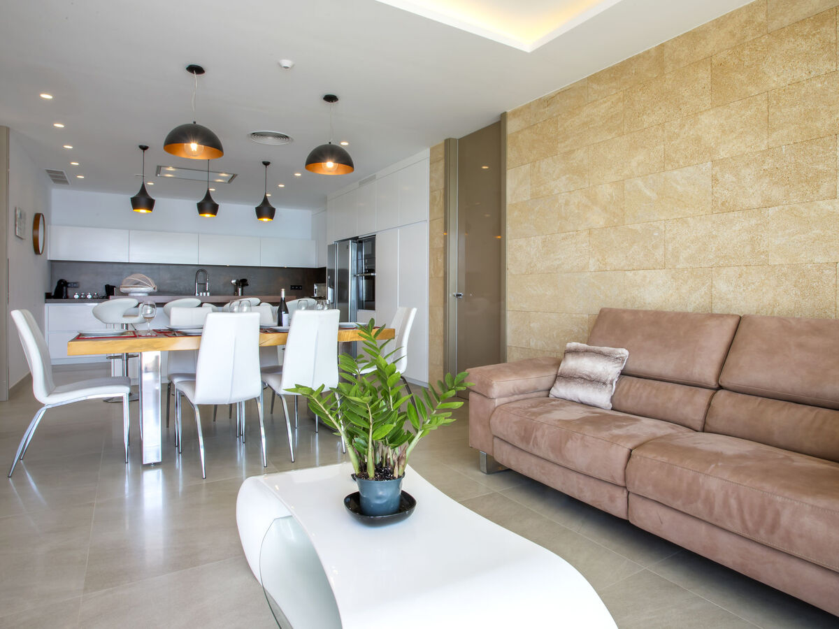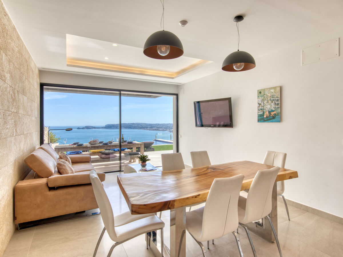 Spacieux et clair, aménagement très moderne et luxueux: séjour/salle à manger avec cheminée, table pour les repas, TV (satellite) et Télévision numérique.