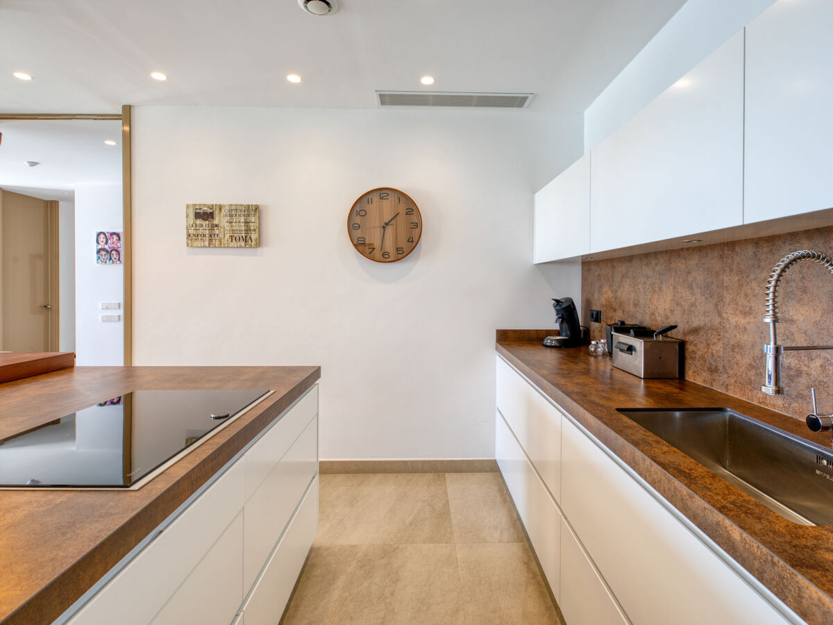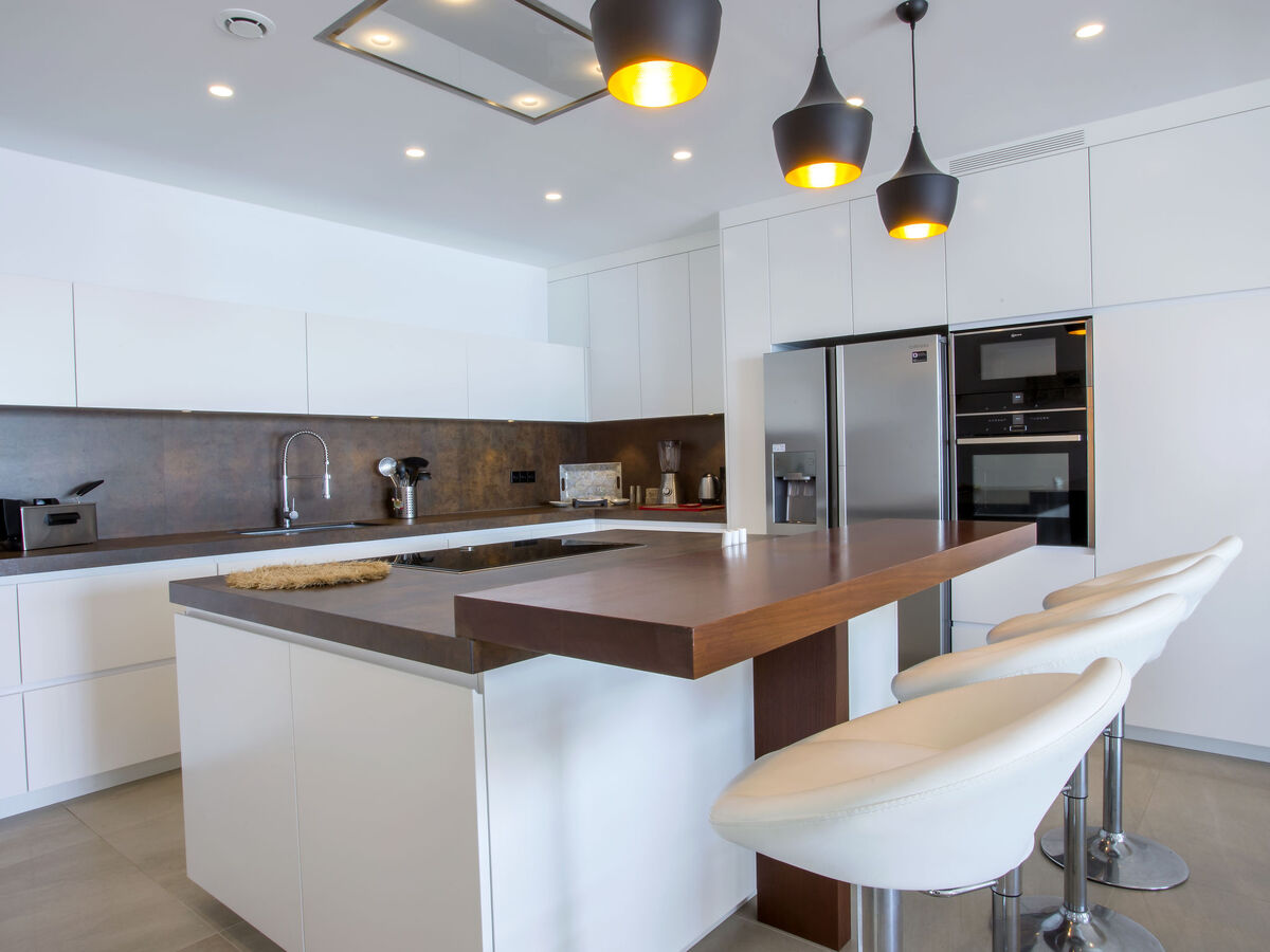 Grande cuisine (four, lave-vaisselle, 4 plaques à induction, grille-pain, bouilloire électrique, micro-ondes, congélateur, cafetière électrique, ilot de cuisine).