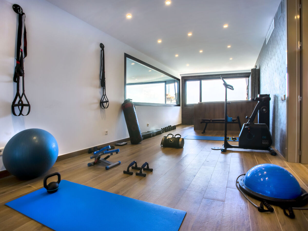 A l'étage inférieur il y a aussi une salle de gym avec bain à remous et toilettes.