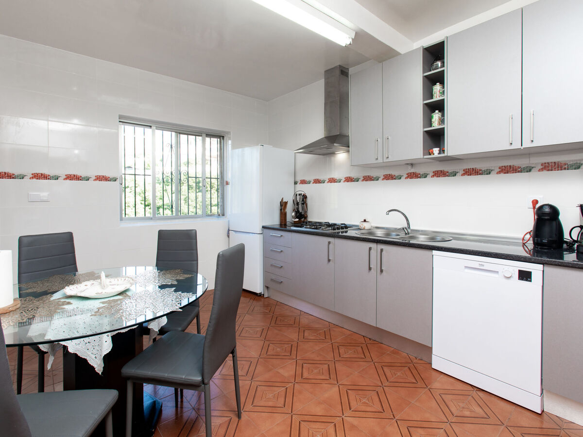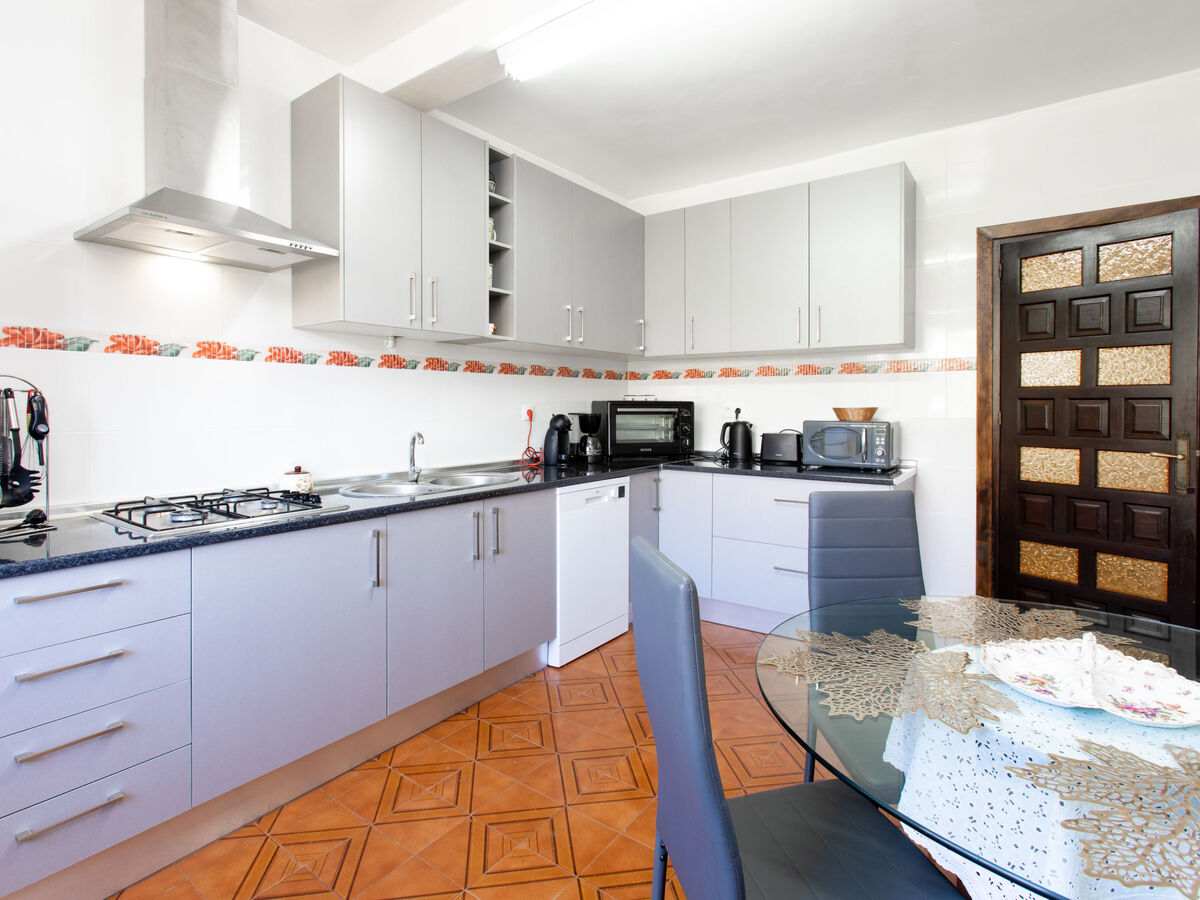 Grande cuisine (four, lave-vaisselle, 4 feux, grille-pain, bouilloire électrique, micro-ondes, congélateur, cafetière électrique) avec table pour les repas, passe-plat.