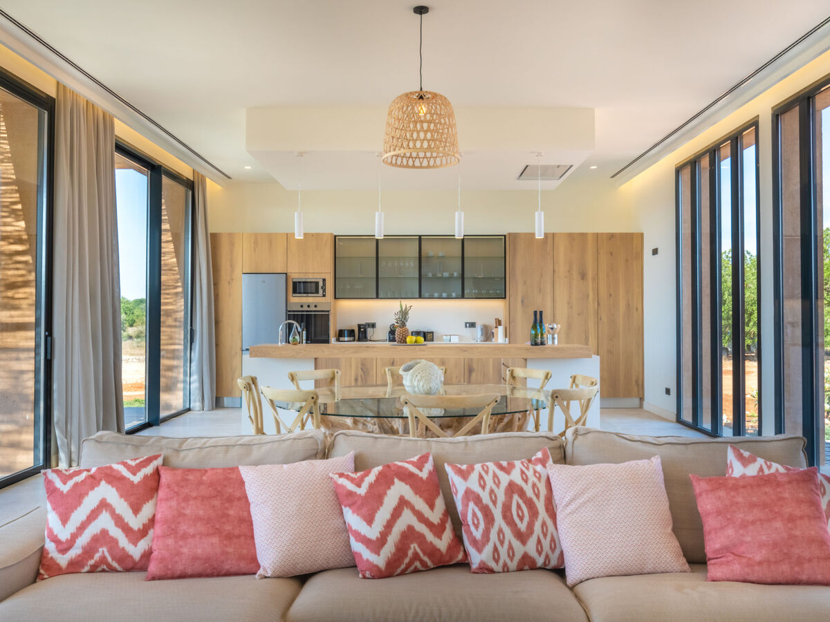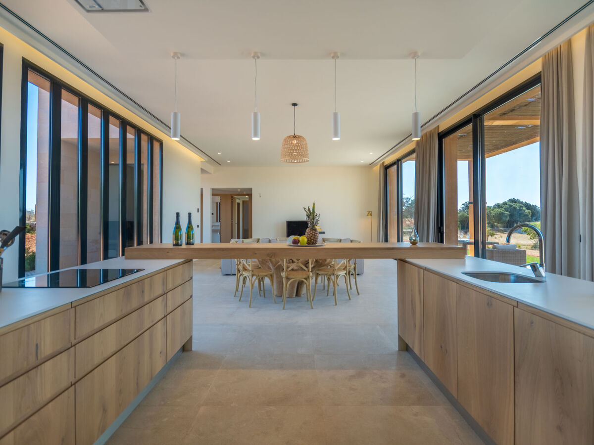 Grande cuisine ouverte (four, lave-vaisselle, 4 plaques vitrocéramiques, micro-ondes, congélateur, cafetière électrique, ilot de cuisine) avec bar, air-conditionné et chauffage à air chaud.