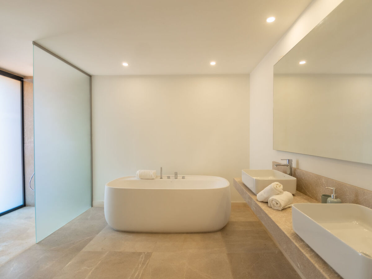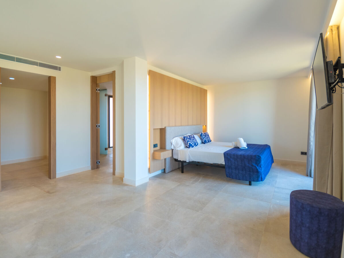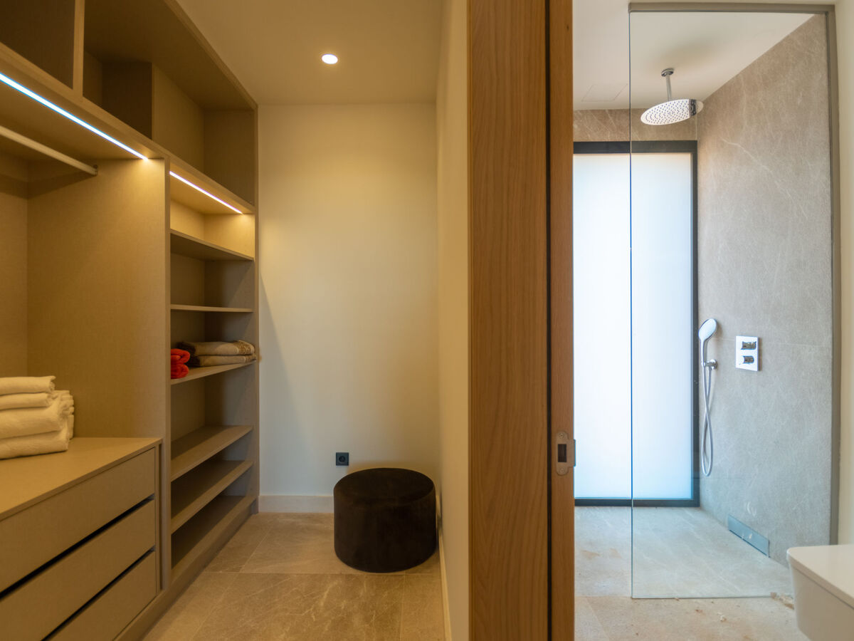 1 grande chambre double avec porte coulissante, baie vitrée Dressing avec 2 lits (90 cm, longueur 200 cm), bain/douche/WC, double vasque, TV, écran plat, air-conditionné et chauffage à air chaud.