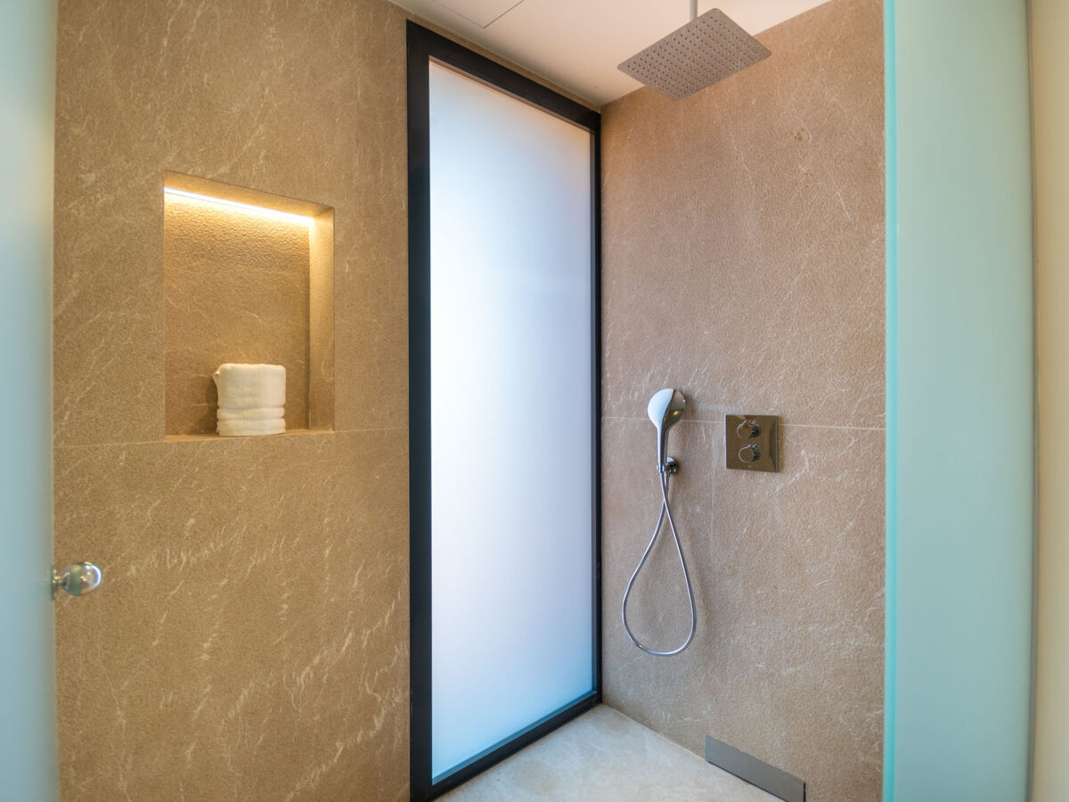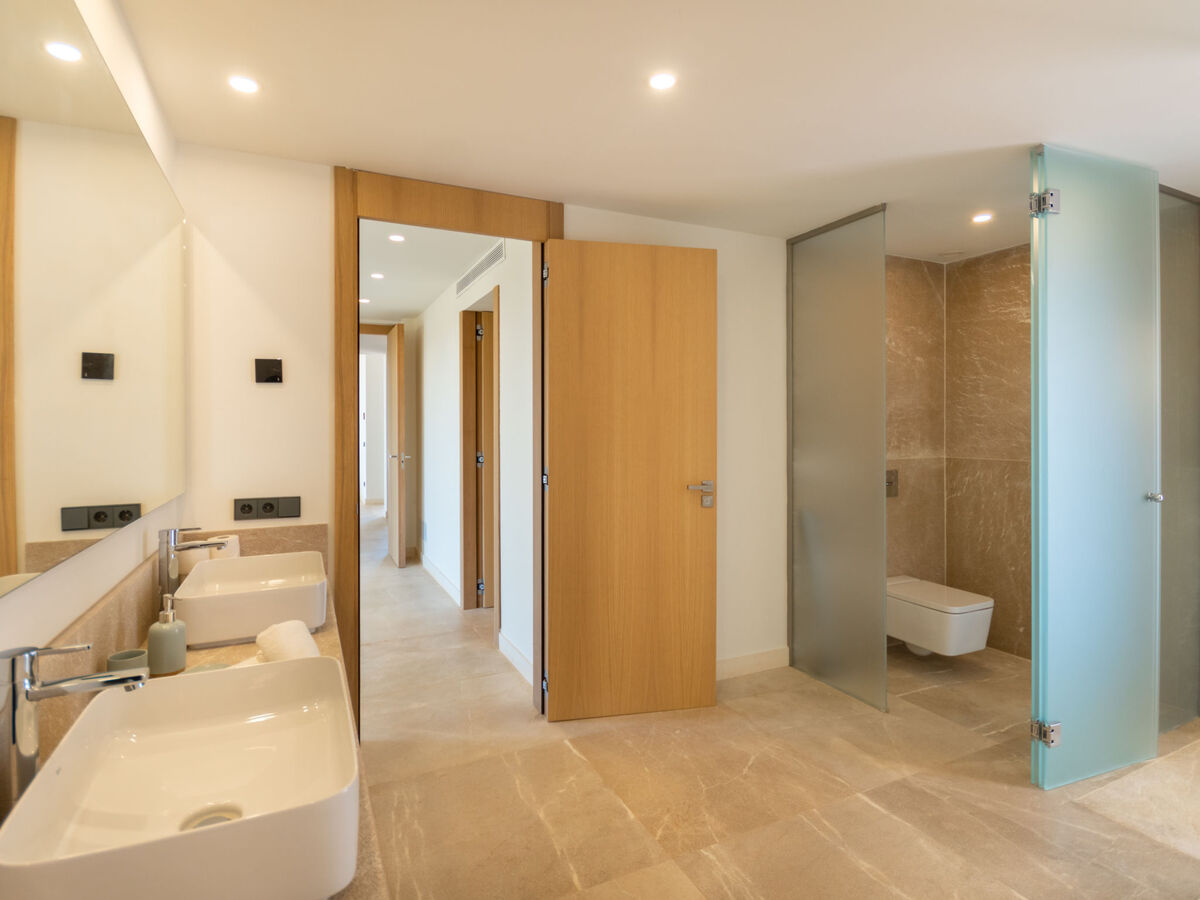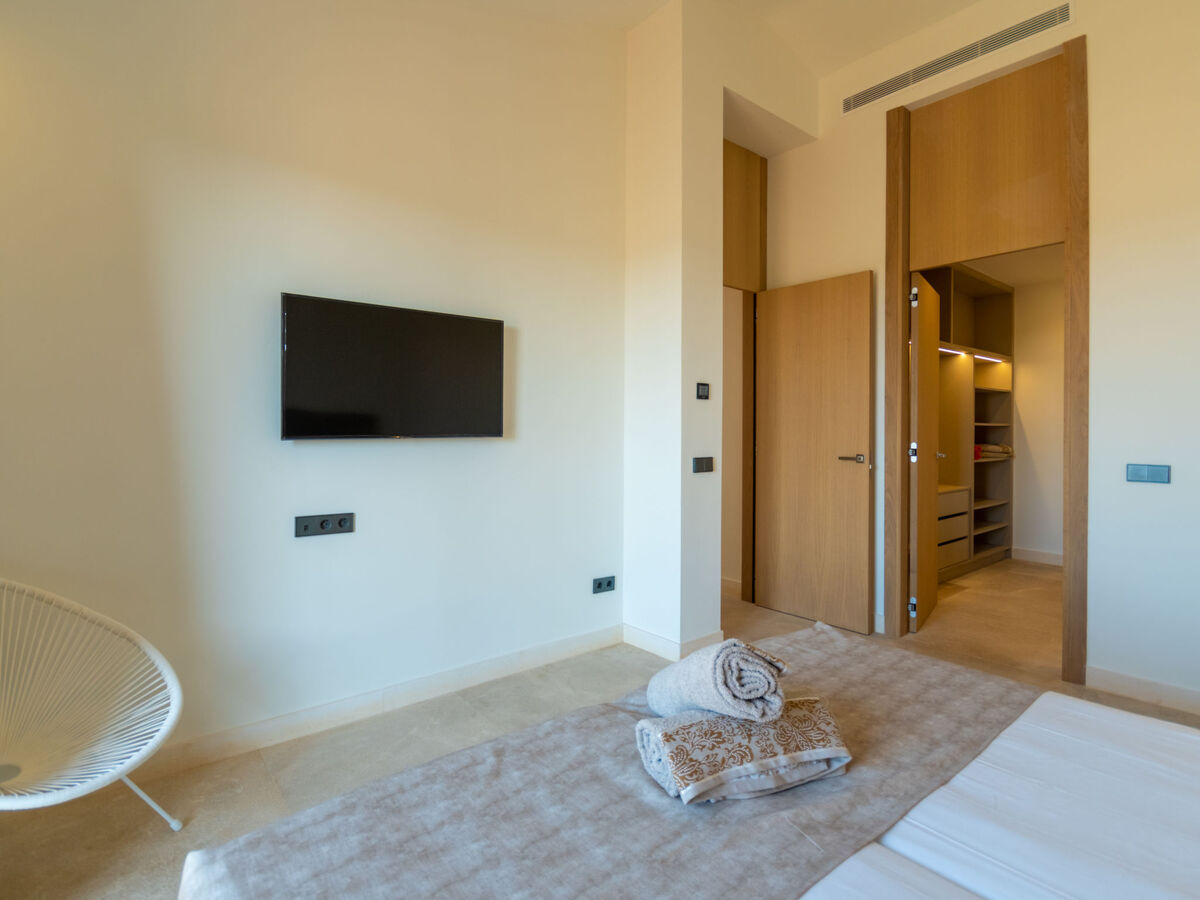 1 grande chambre double avec porte coulissante, baie vitrée Dressing avec 2 lits (90 cm, longueur 200 cm), bain/douche/WC, double vasque, TV, écran plat, air-conditionné et chauffage à air chaud.
