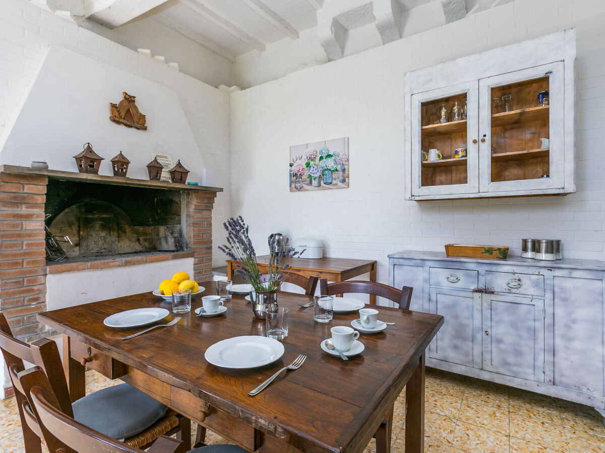 Cuisine (5 plaques de cuisson, four, lave-vaisselle, bouilloire électrique, congélateur, cafetière électrique) avec cheminée et coin repas.