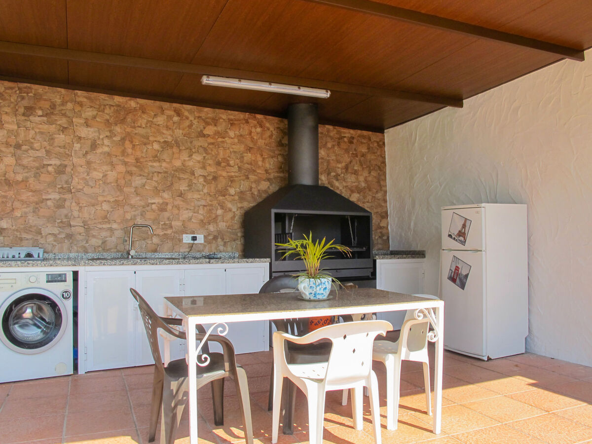 Cuisine ouverte (four, 4 feux, grille-pain, bouilloire électrique, micro-ondes, congélateur, cafetière électrique) avec ventilateur.