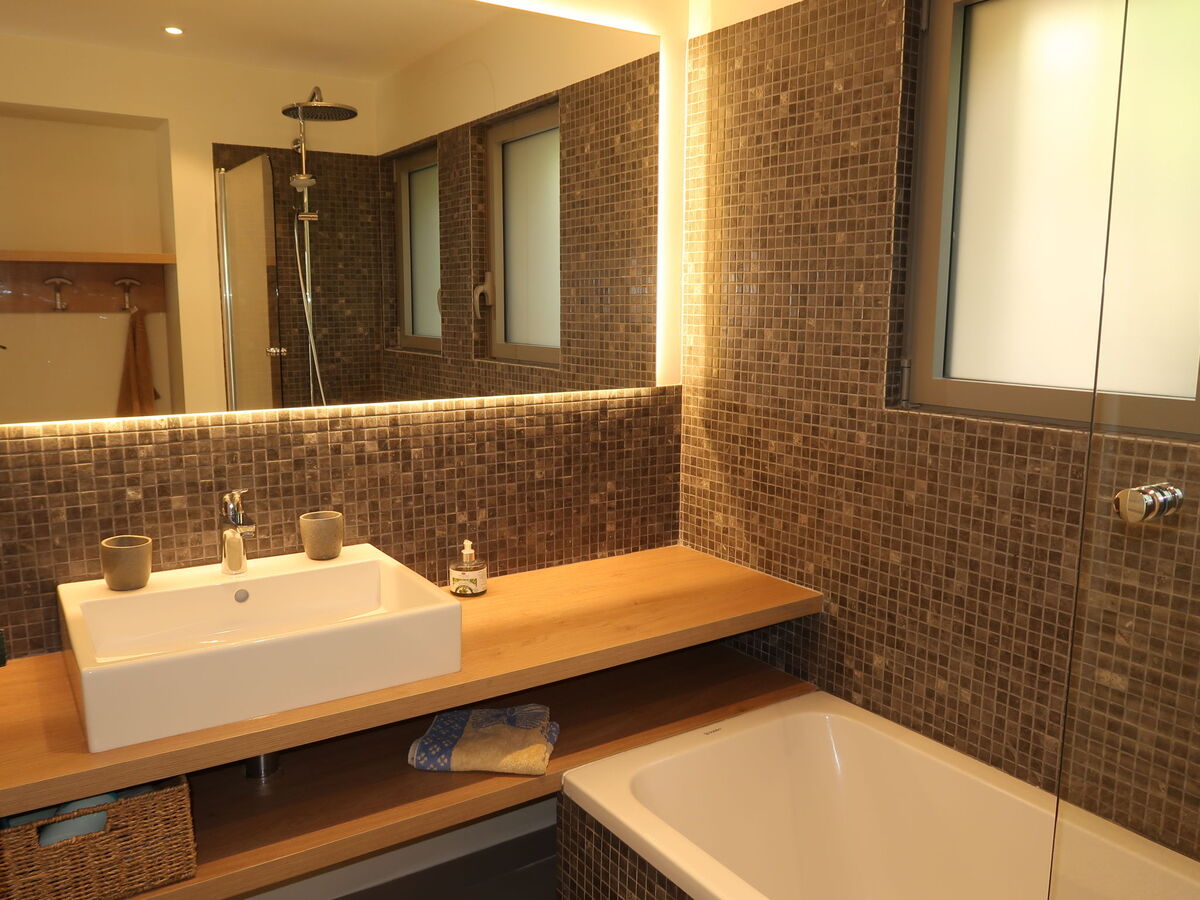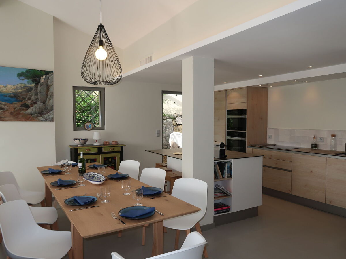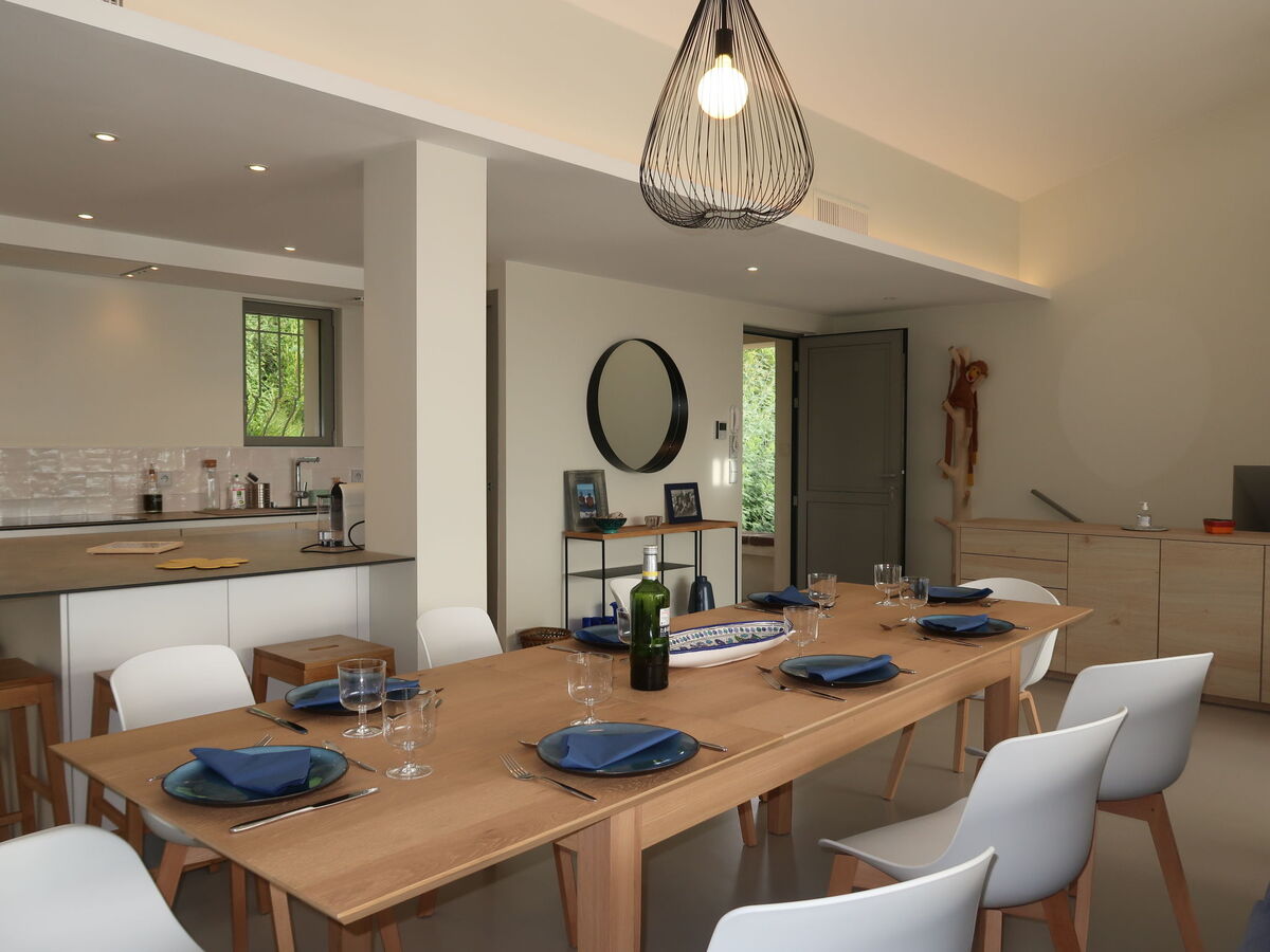 Cuisine ouverte (four, lave-vaisselle, 4 plaques à induction, grille-pain, bouilloire électrique, micro-ondes, congélateur, cafetière électrique).