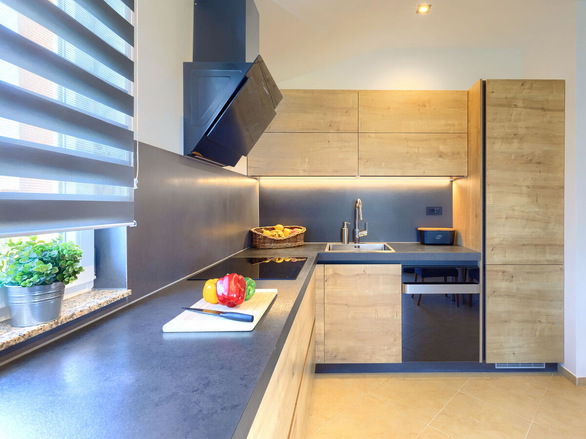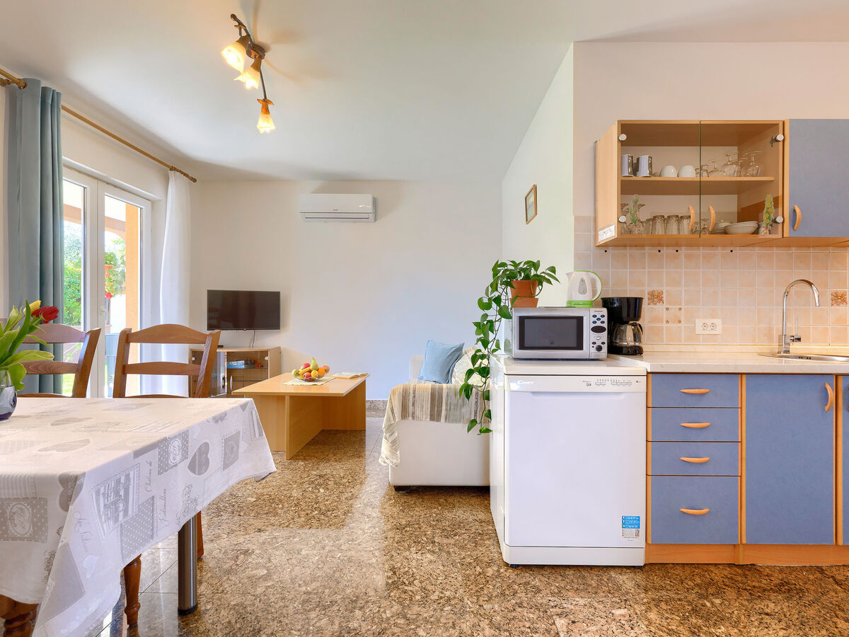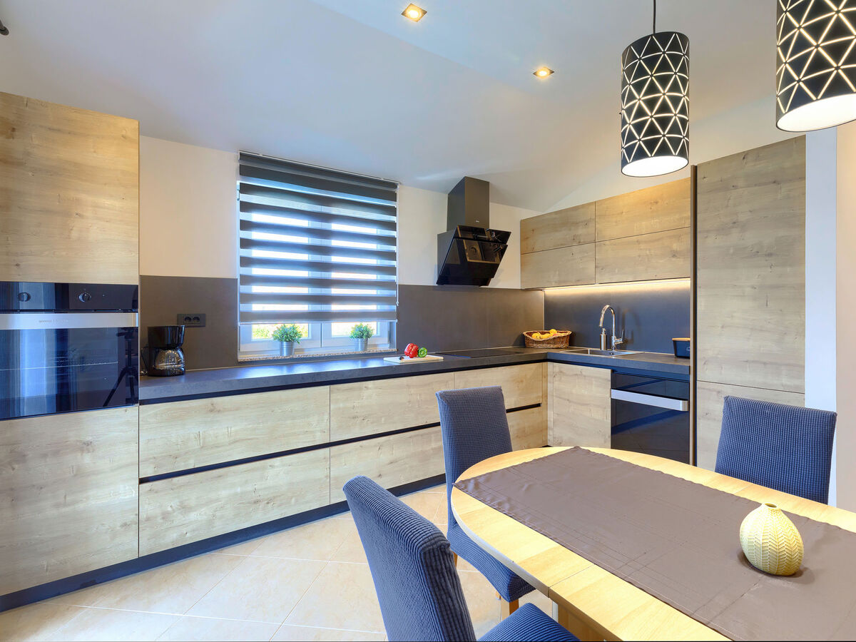 Cuisine (lave-vaisselle, 4 plaques à induction, grille-pain, bouilloire électrique, micro-ondes, cafetière électrique) avec table pour les repas, air-conditionné.