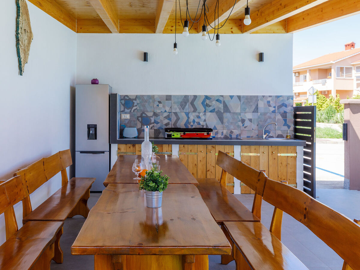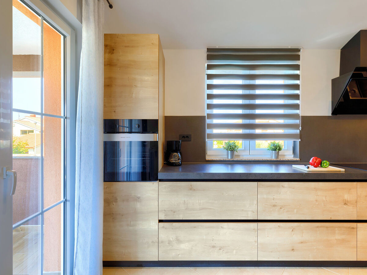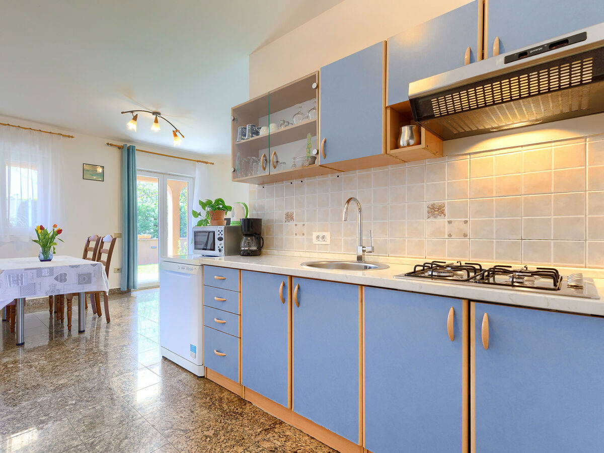Cuisine (lave-vaisselle, 4 plaques à induction, grille-pain, bouilloire électrique, micro-ondes, cafetière électrique) avec table pour les repas, air-conditionné.