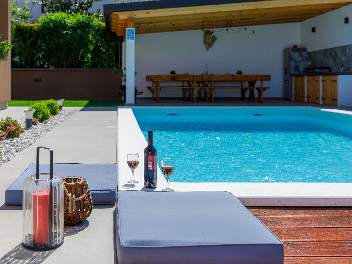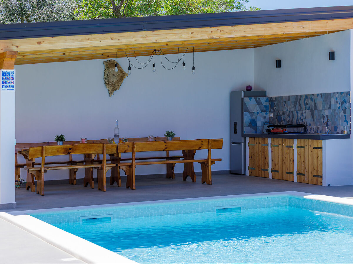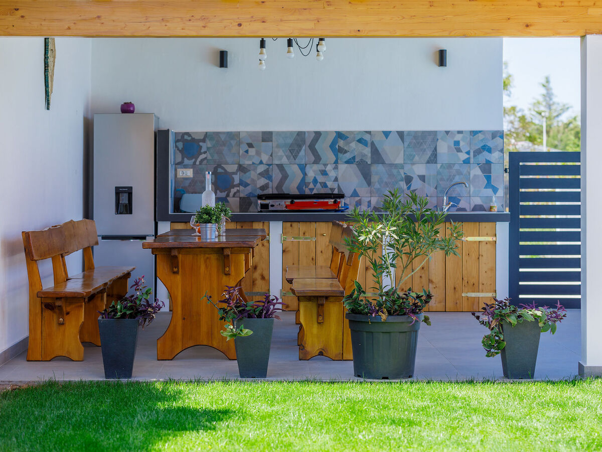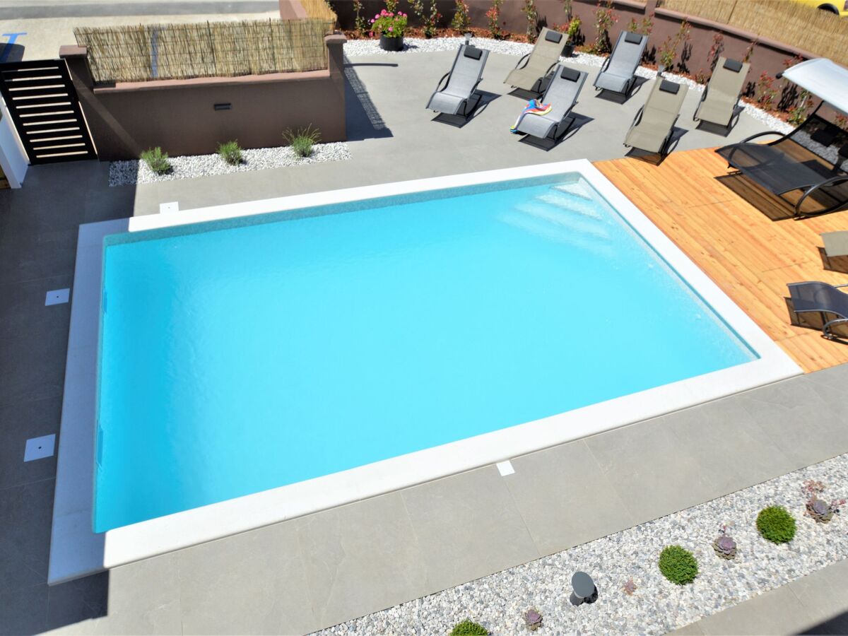 A usage privé: terrain 600 m2, pelouse 40 m2, piscine rectangulaire (7 x 4 m, profondeur 140 cm, disponibilité saisonnière: 01.Mai.