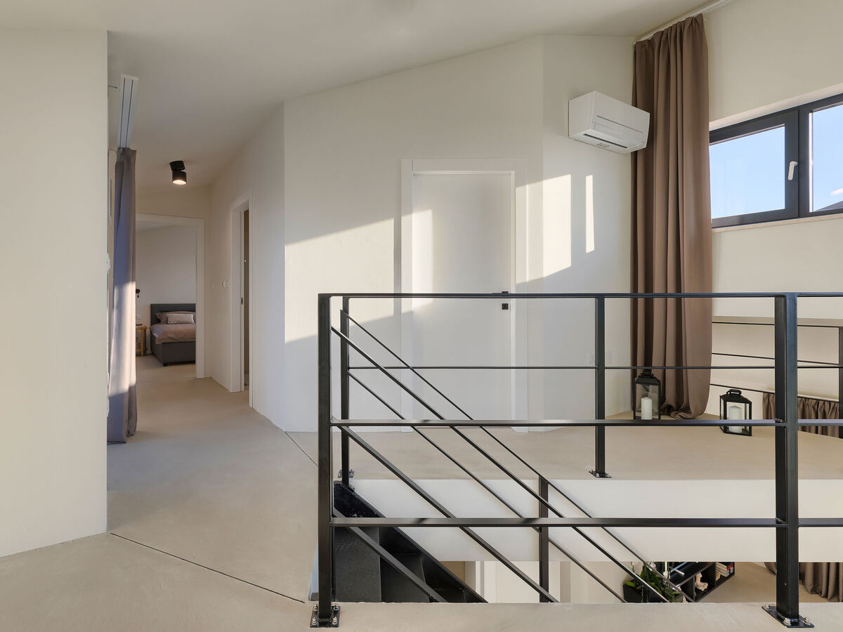 À l'étage supérieur: chambre avec passage ouverte avec 2 divans-lits (90 cm, longueur 200 cm), TV (satellite) (écran plat), air-conditionné.