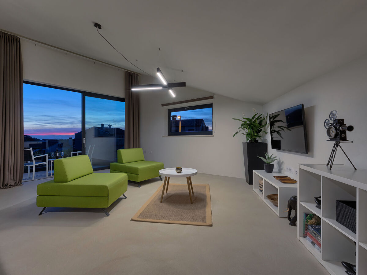 Séjour/salle à manger avec TV (satellite) (écran plat), air-conditionné.