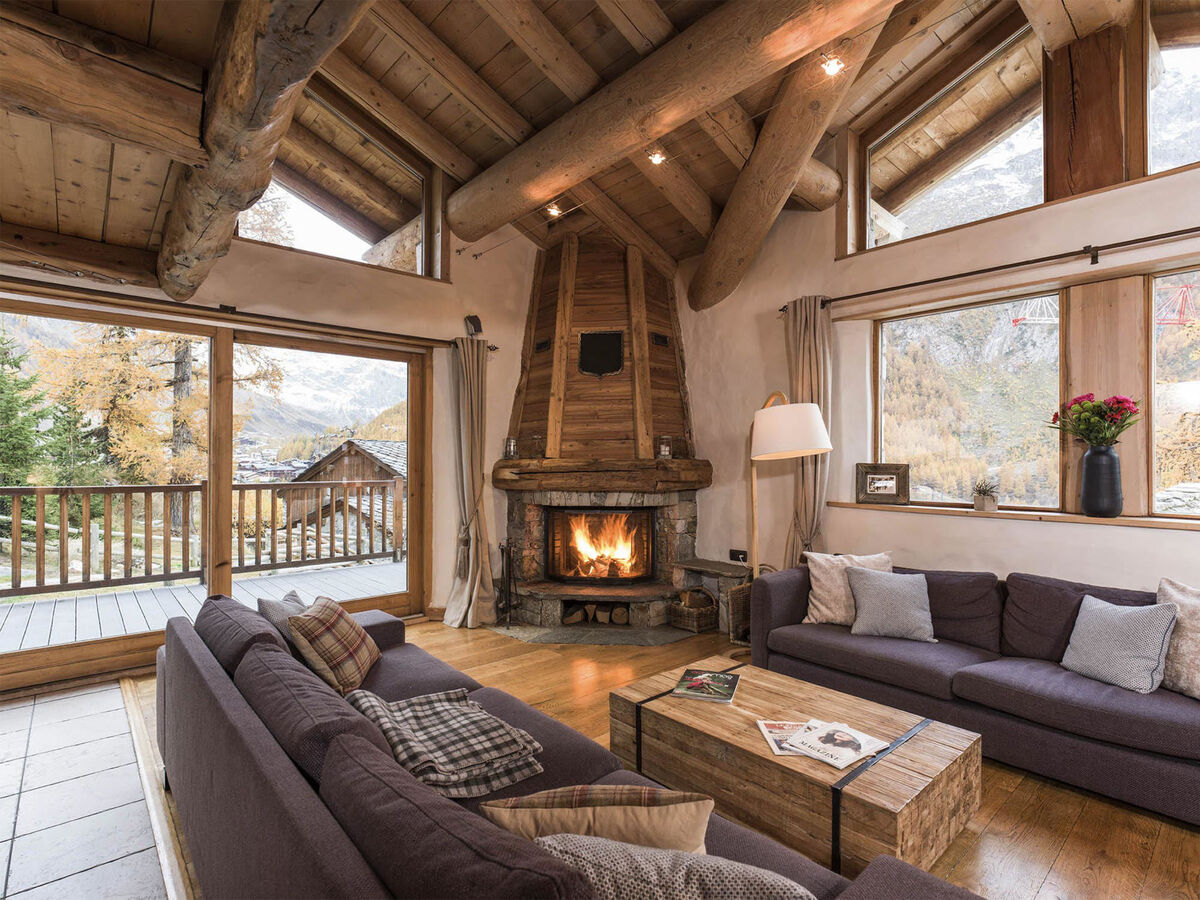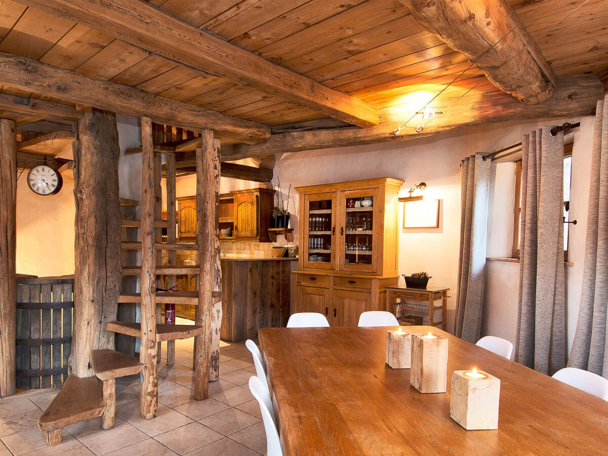 2ème étage: séjour/salle à manger avec cheminée et table pour les repas.