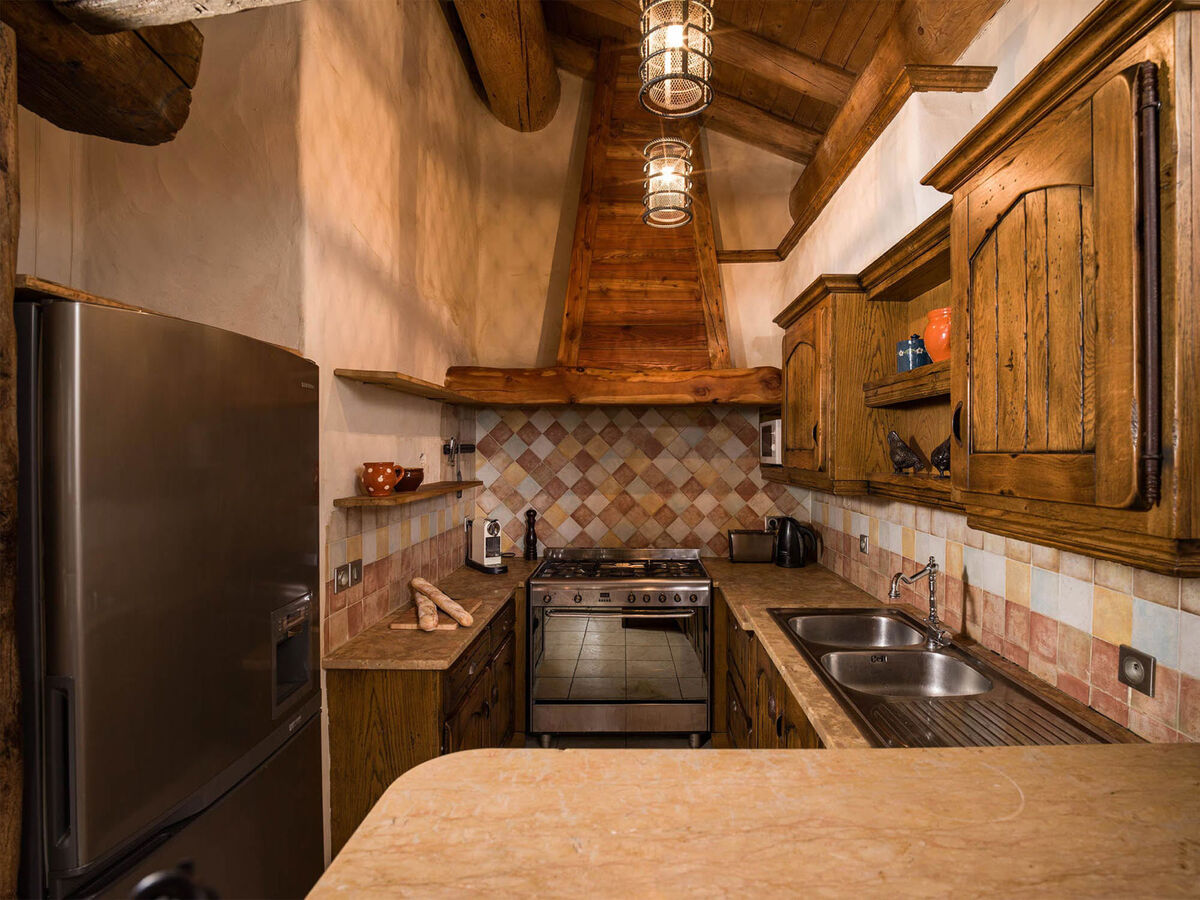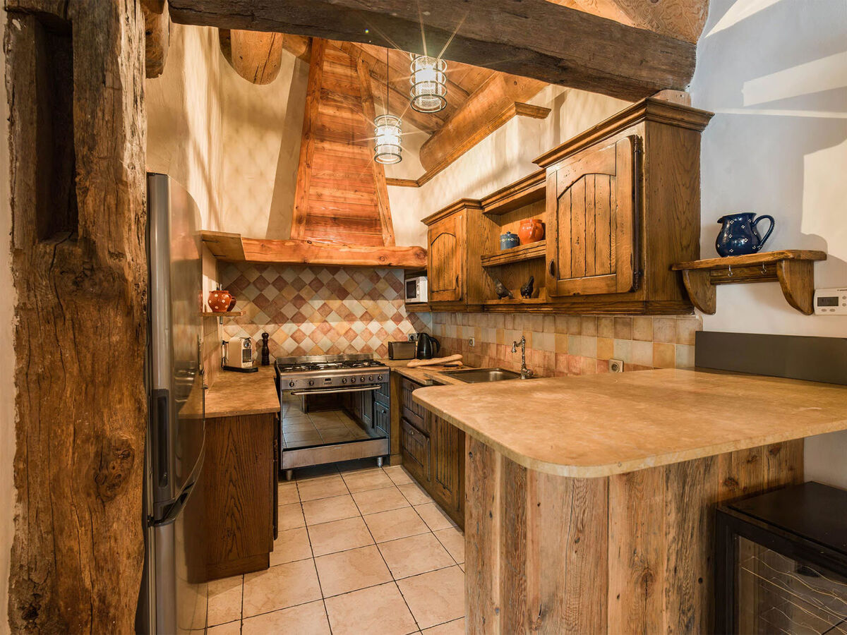 Cuisine ouverte (four, lave-vaisselle, 4 plaques vitrocéramiques, grille-pain, bouilloire électrique, congélateur, cafetière électrique, appareil à raclette).