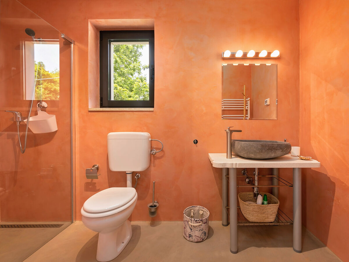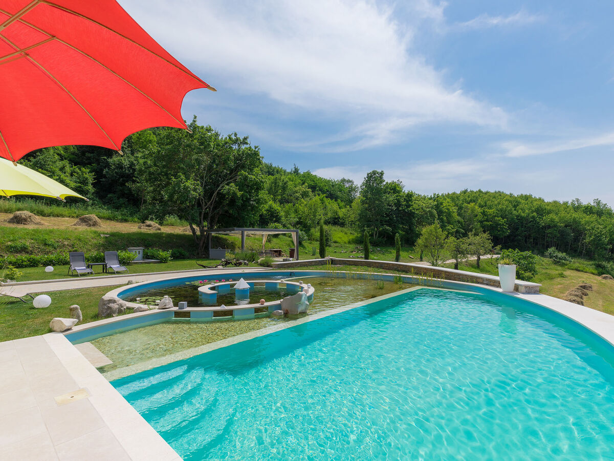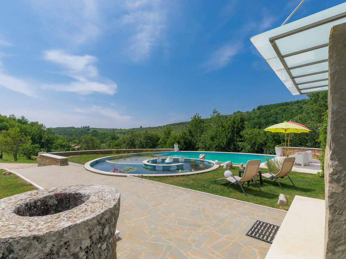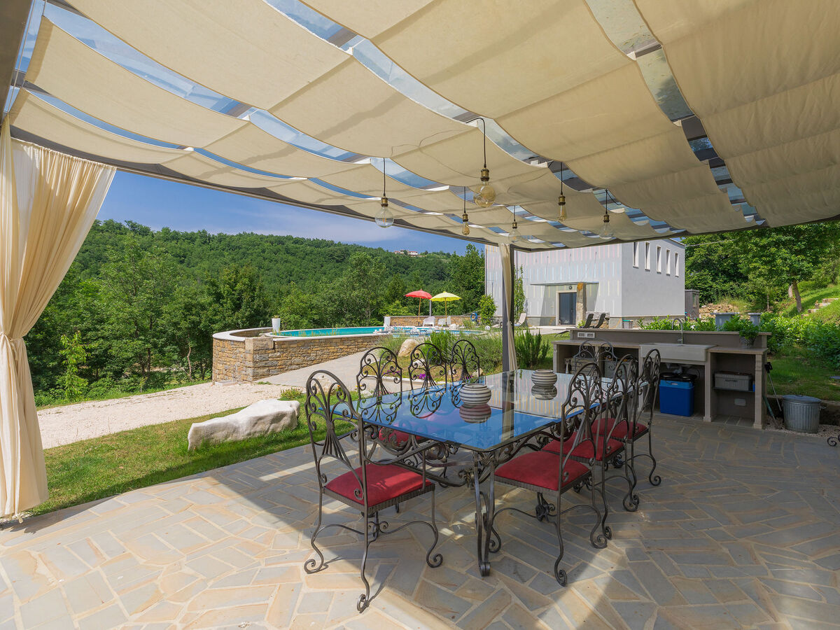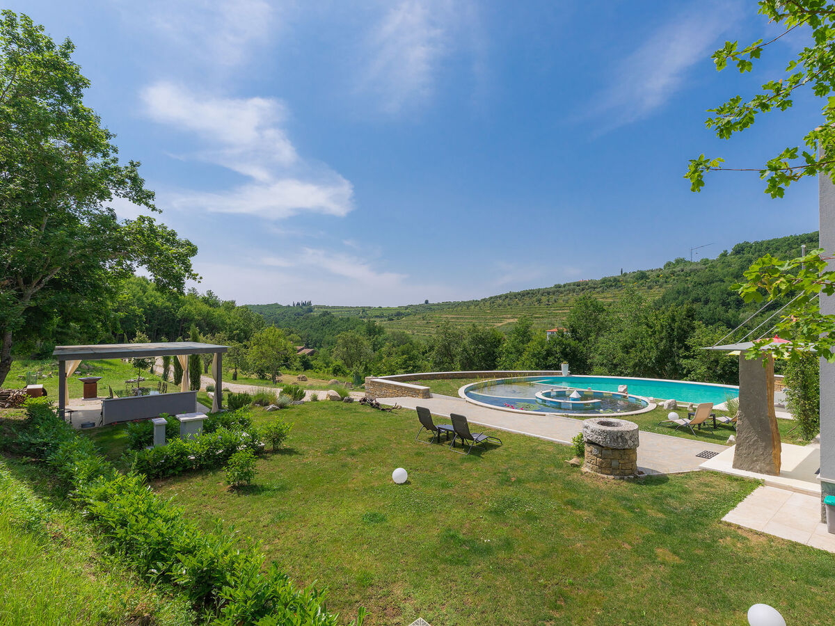 À 400 m du centre de Momjan, à 17 km du centre d'Umag, situation tranquille, ensoleillée sur un versant, à 17 km de la mer, dans la verdure.
