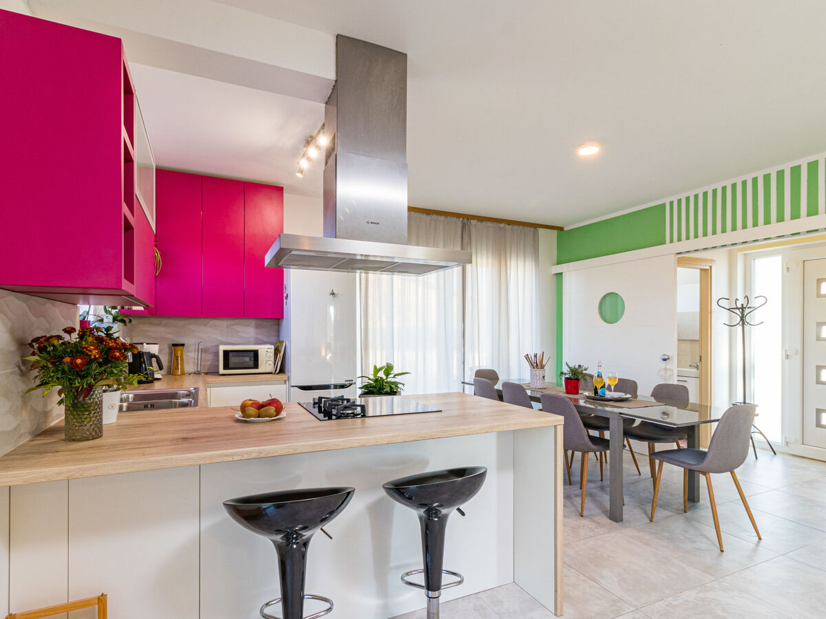 Cuisine ouverte (four, 2 plaques vitrocéramiques, 2 feux, grille-pain, bouilloire électrique, micro-ondes, congélateur, cafetière électrique).