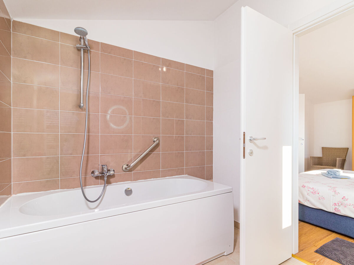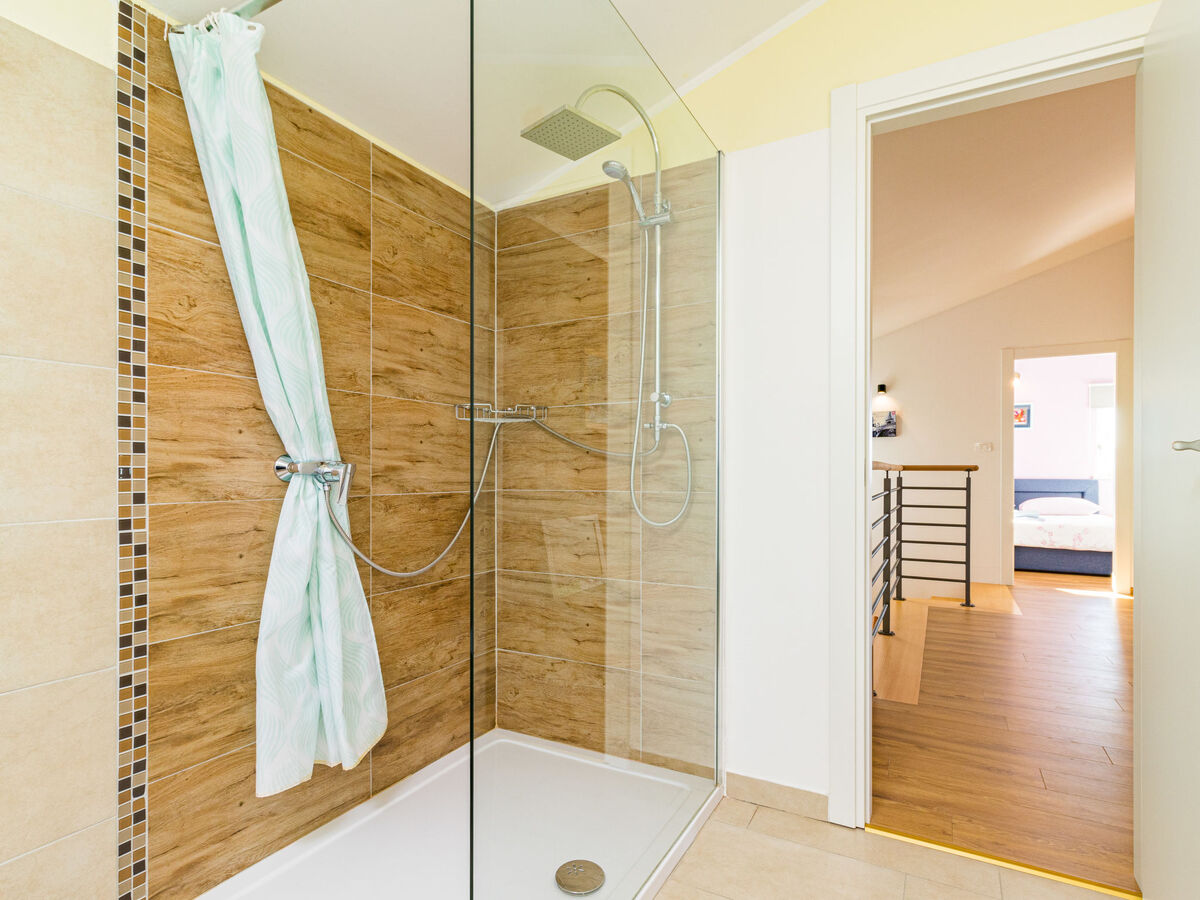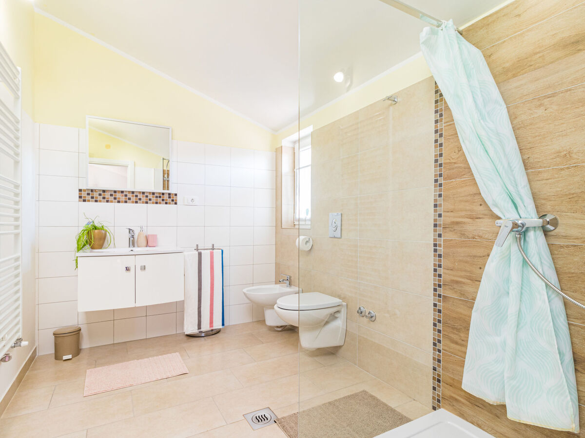 À l'étage supérieur: 1 chambre 10 m2 avec 1 grand-lit (180 cm, longueur 200 cm), bain/bidet/WC et air-conditionné.