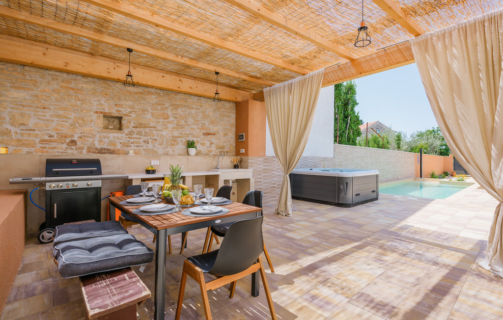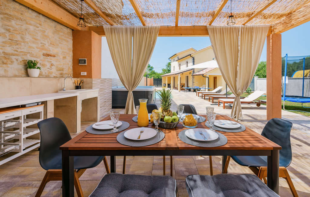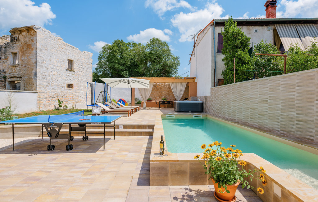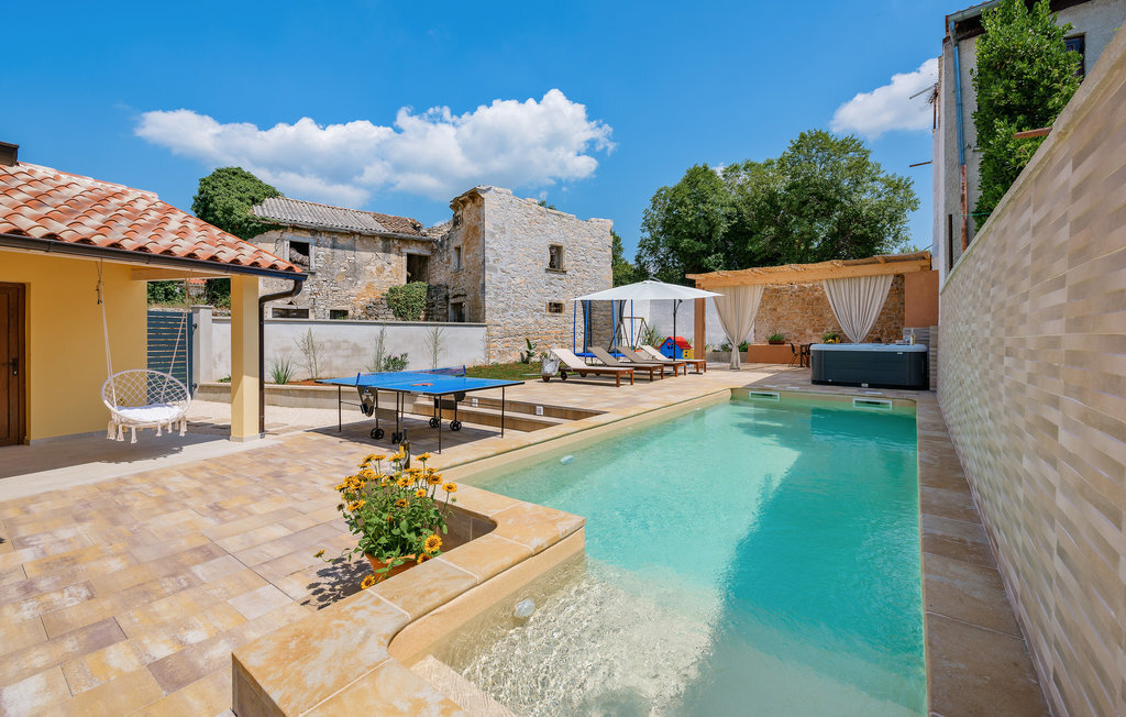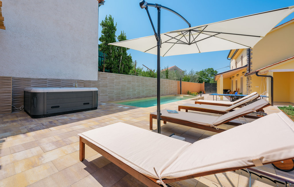 Bien-être à l'extérieur : Location de vacances disposant de chaises-longues et d'un ou plusieurs équipements tels que piscine extérieure, jacuzzi extérieur, lit à baldaquin de jardin etc...