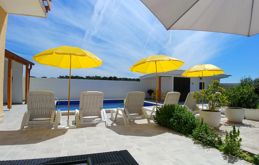 Sur le solarium joliment planté se trouve la piscine dans laquelle petits et grands peuvent se rafraîchir. Des chaises longues confortables avec des parasols invitent à la détente et tout autour s'étend la nature pittoresque des environs.