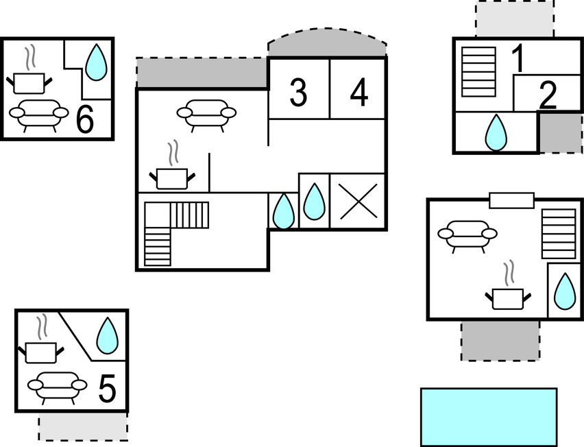 Deux maisons proches qui sont idéales pour plusieurs familles ou un grand groupe d'amis. La maison idéale pour quatre personnes est celle où se trouvent au rez-de-chaussée la cuisine, le salon et la salle de bain, et à l'étage la deuxième chambre à coucher par une pièce de passage. Dans la deuxième maison, il y a trois étages, chacun avec une unité d'habitation qui n'est accessible que de l'extérieur, le propriétaire habitant l'autre moitié de la maison. Au premier étage se trouve un grand appartement avec des chambres à coucher, une cuisine, une salle à manger et des salles de bain. Au rez-de-chaussée et à l'entresol se trouve un studio avec une kitchenette.