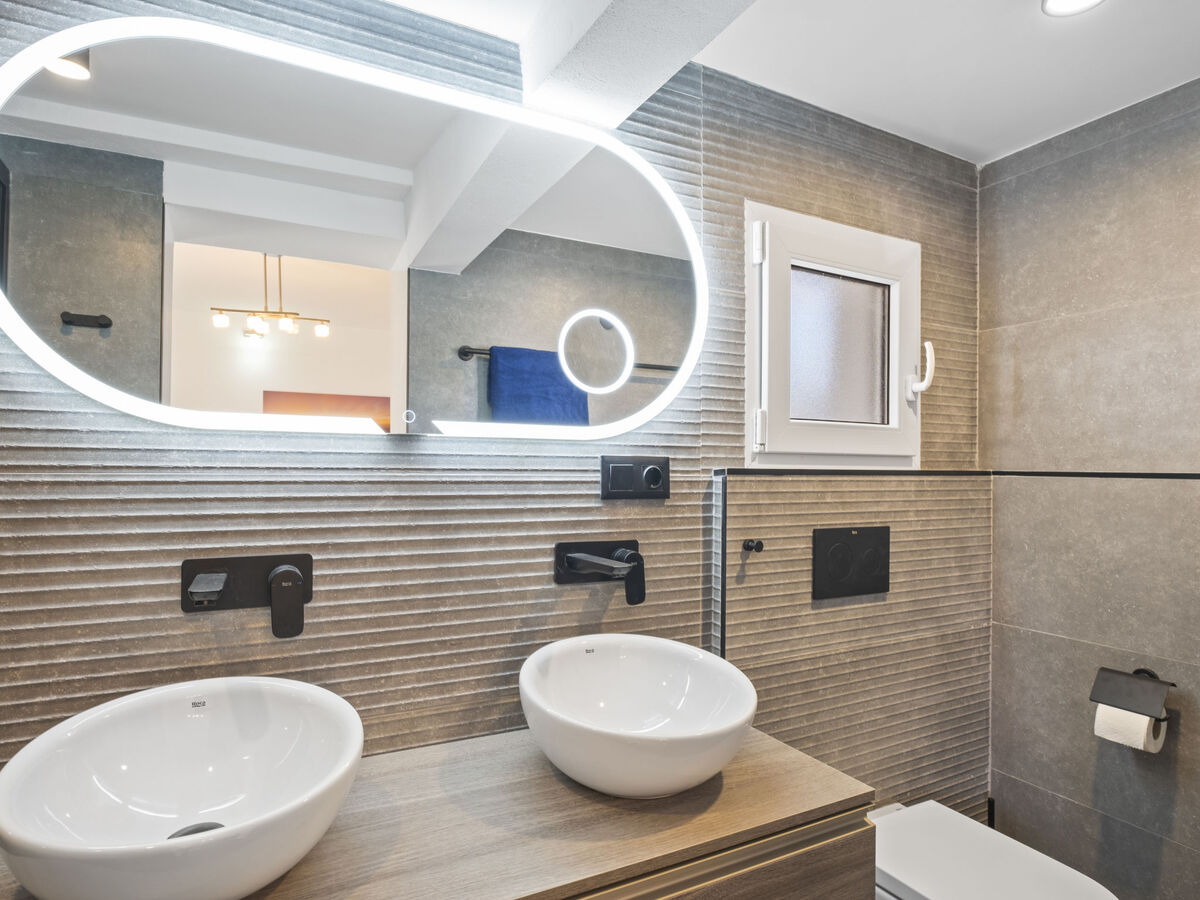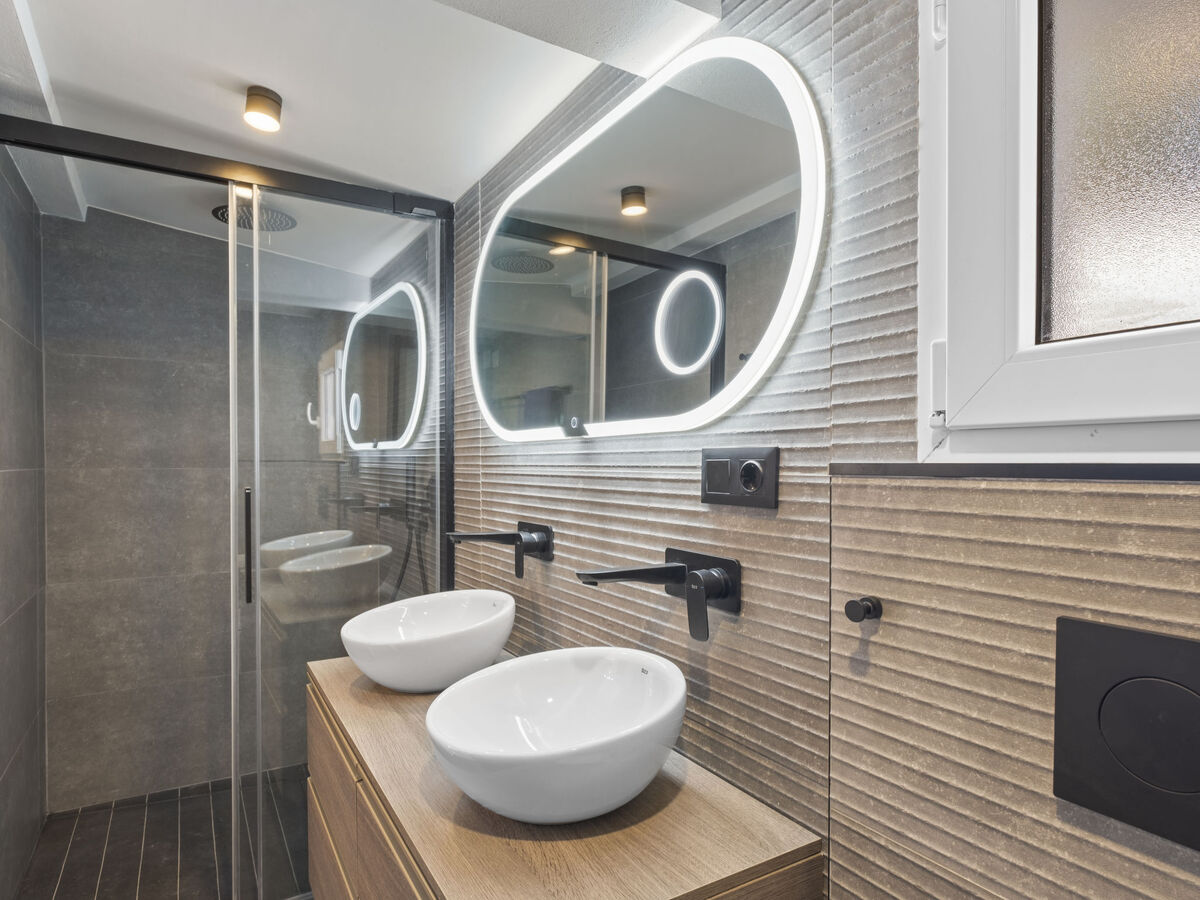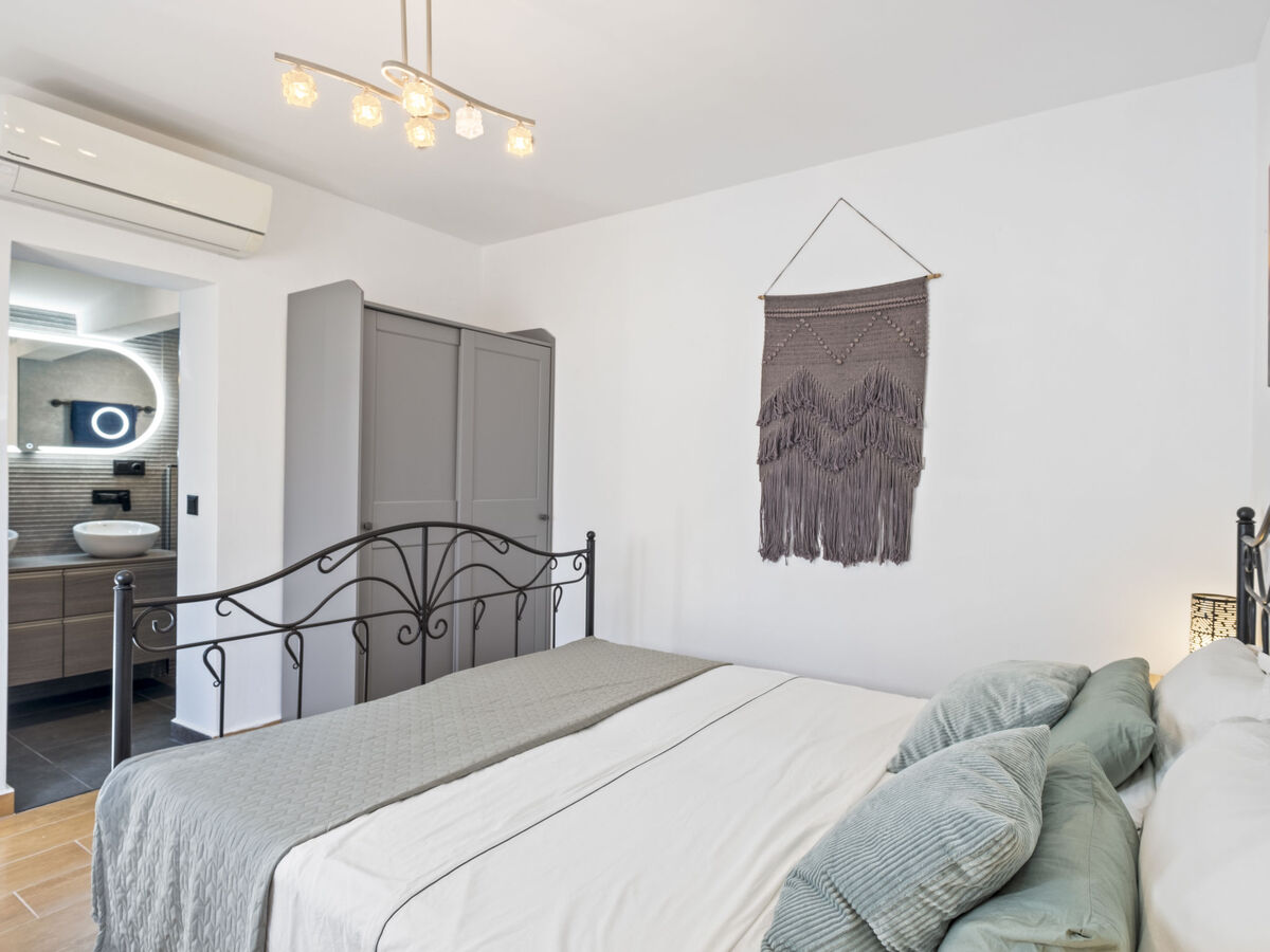 1 chambre avec 1 grand-lit (180 cm, longueur 200 cm), douche/WC, double vasque, air-conditionné et chauffage à air chaud.