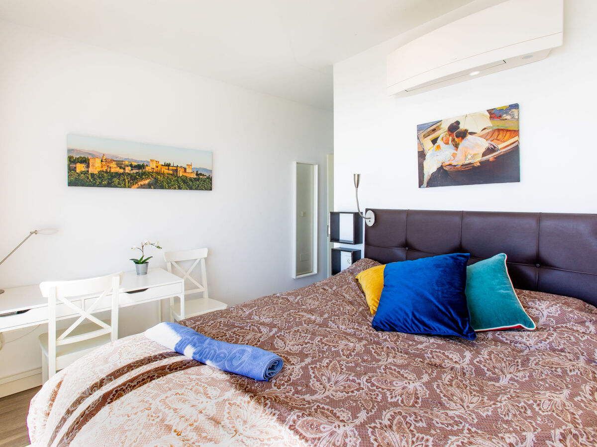 À l'étage supérieur: 1 chambre avec 1 grand-lit (160 cm, longueur 200 cm), bain/WC et air-conditionné.