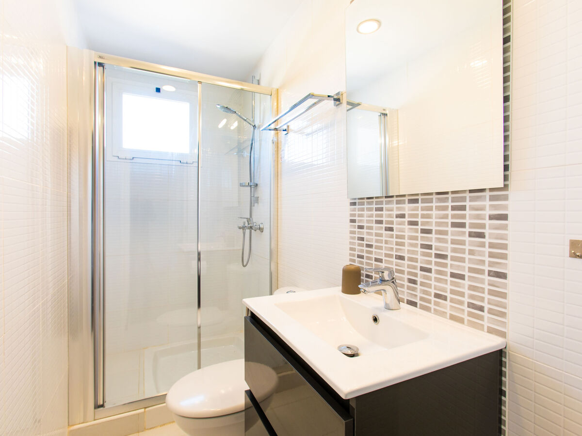 À l'étage inférieur: 1 chambre avec 2 lits (90 cm, longueur 200 cm), douche/WC et air-conditionné.