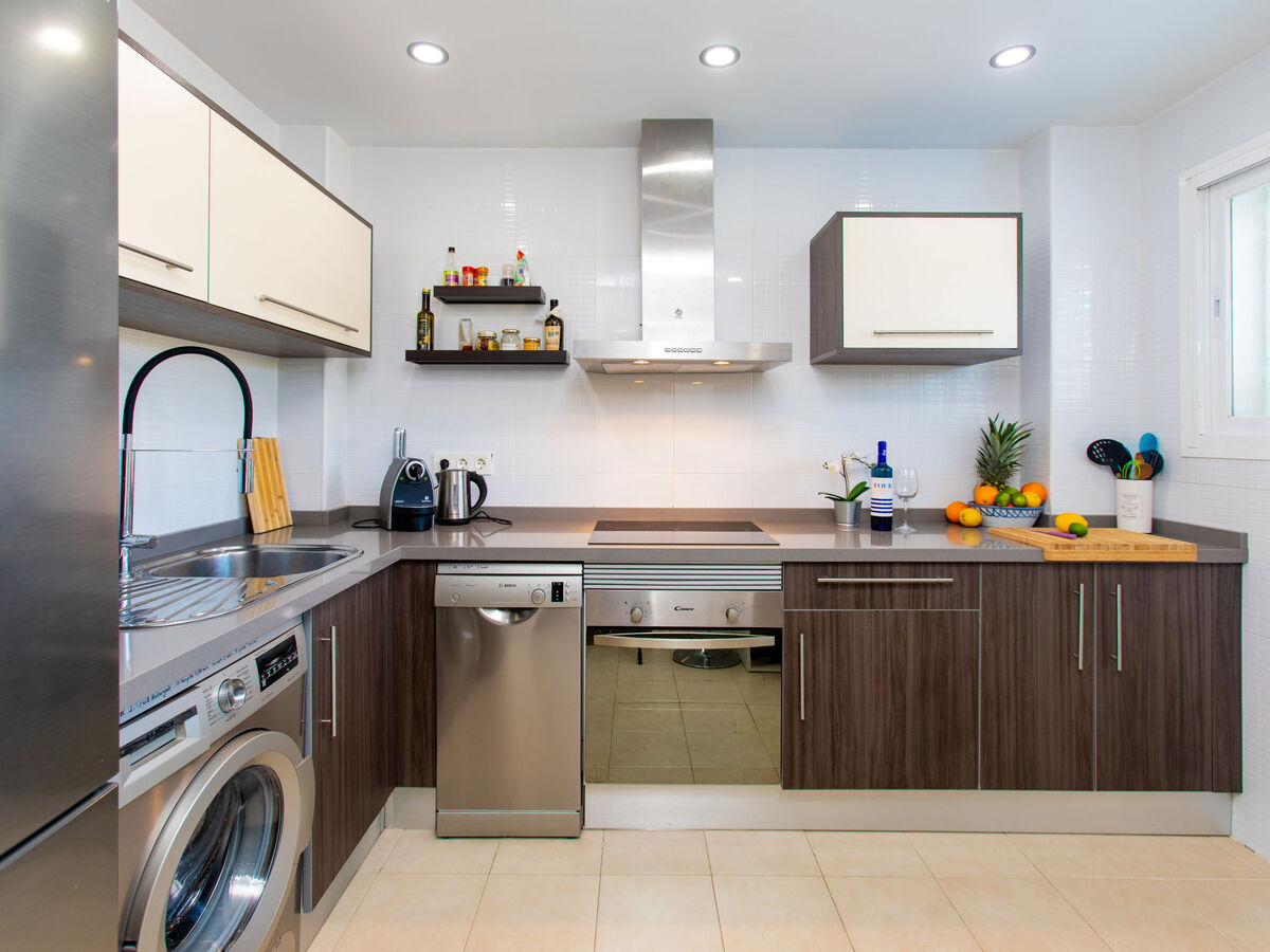 Grande cuisine (four, lave-vaisselle, 4 plaques vitrocéramiques, grille-pain, bouilloire électrique, micro-ondes, congélateur, cafetière électrique) avec table pour les repas.
