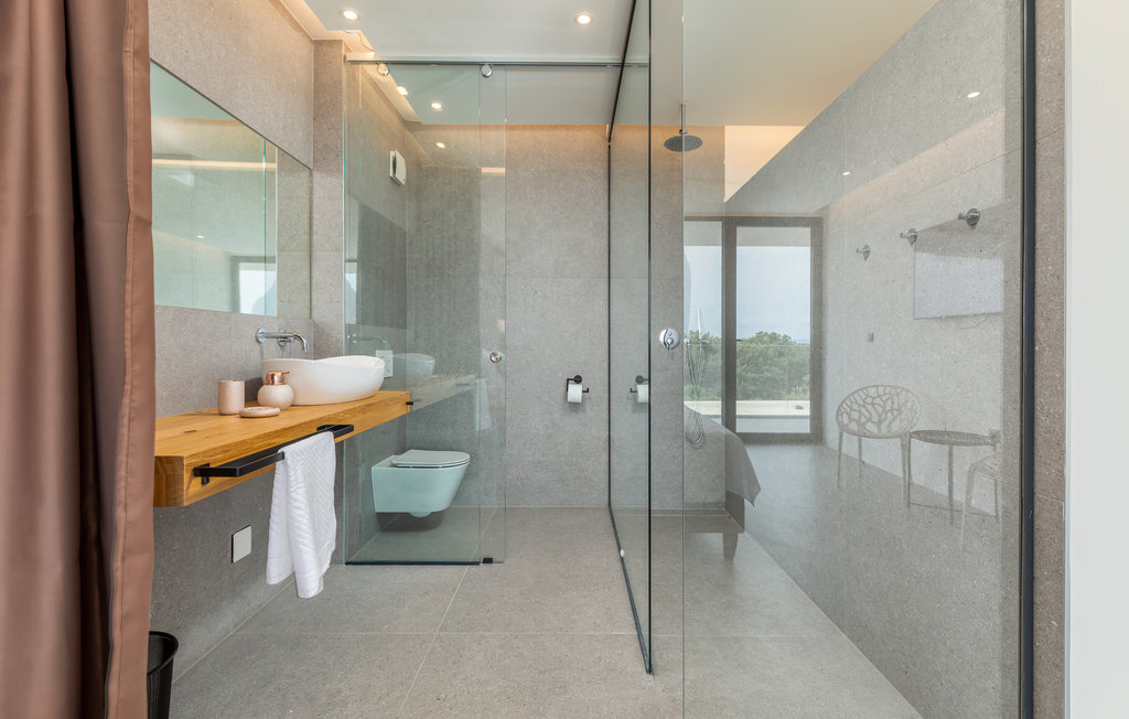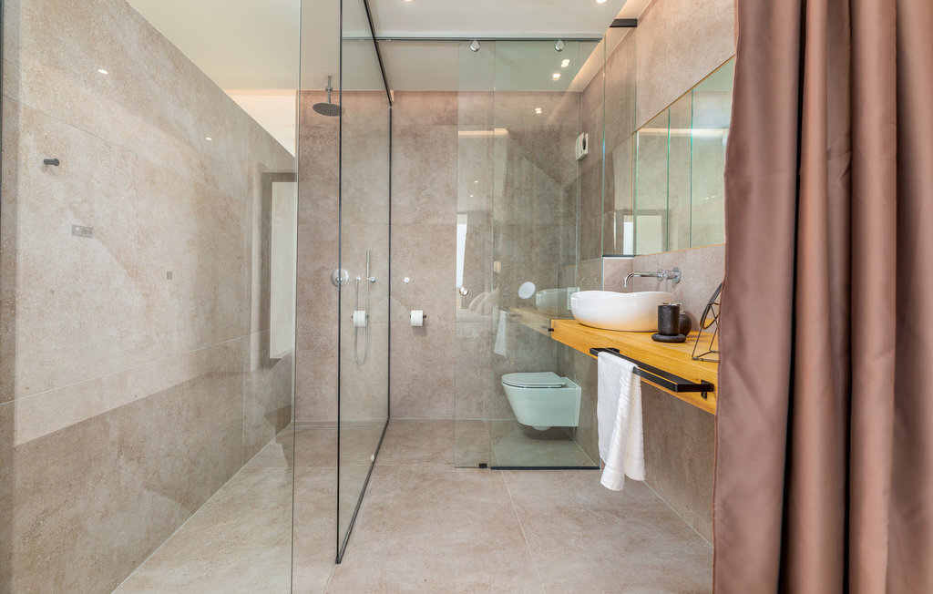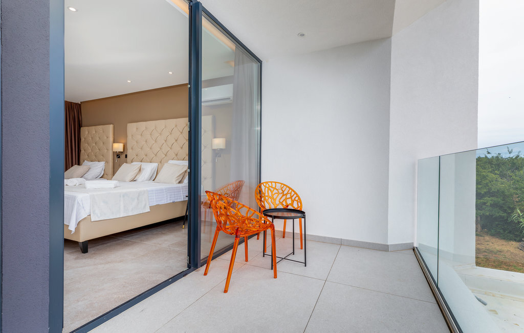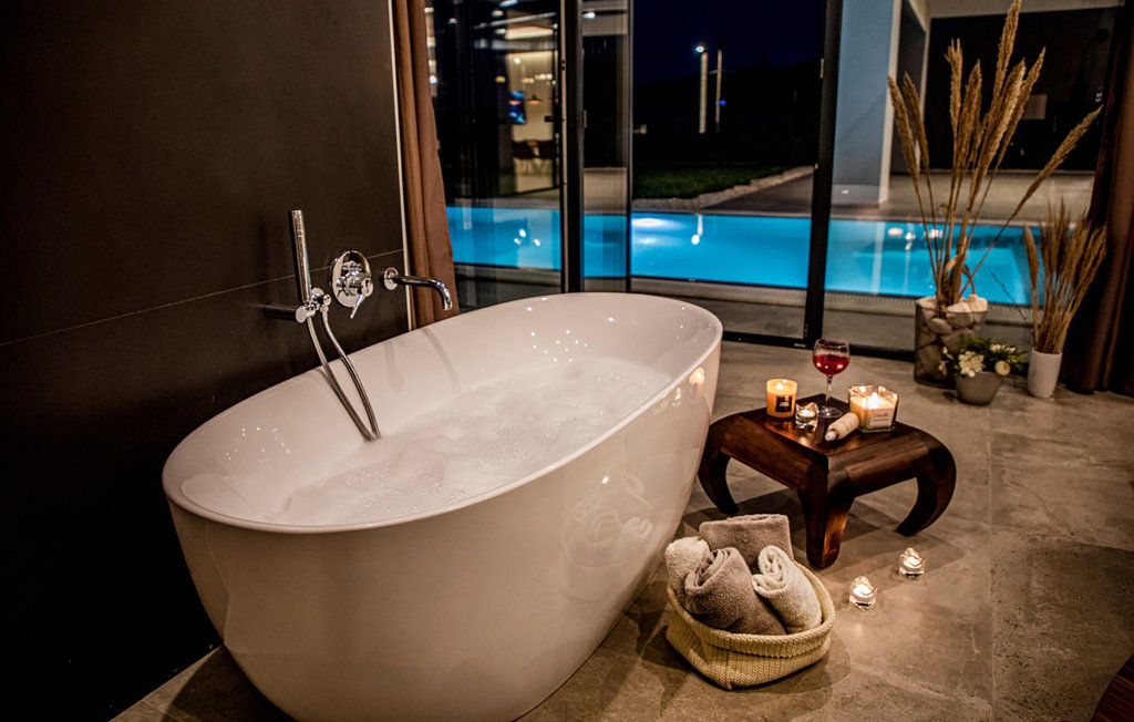 La piscine chauffée est une attraction particulière avec un débordement sur trois côtés, tandis que sur un côté se trouve un rocher en verre massif à travers lequel vous pouvez voir l'eau et les nageurs comme dans un aquarium. Elle dispose de la dernière technique de traitement de la qualité de l'eau et d'un effet thérapeutique amélioré, car le chlore est obtenu naturellement à partir du sel par électrolyse.