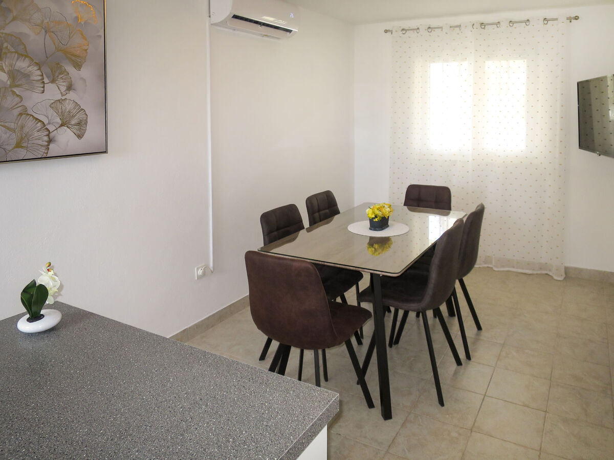 Cuisine ouverte (four, lave-vaisselle, 2 plaques vitrocéramiques, 2 feux, grille-pain, bouilloire électrique, micro-ondes, congélateur, cafetière électrique) avec table pour les repas, TV (satellite) et air-conditionné.