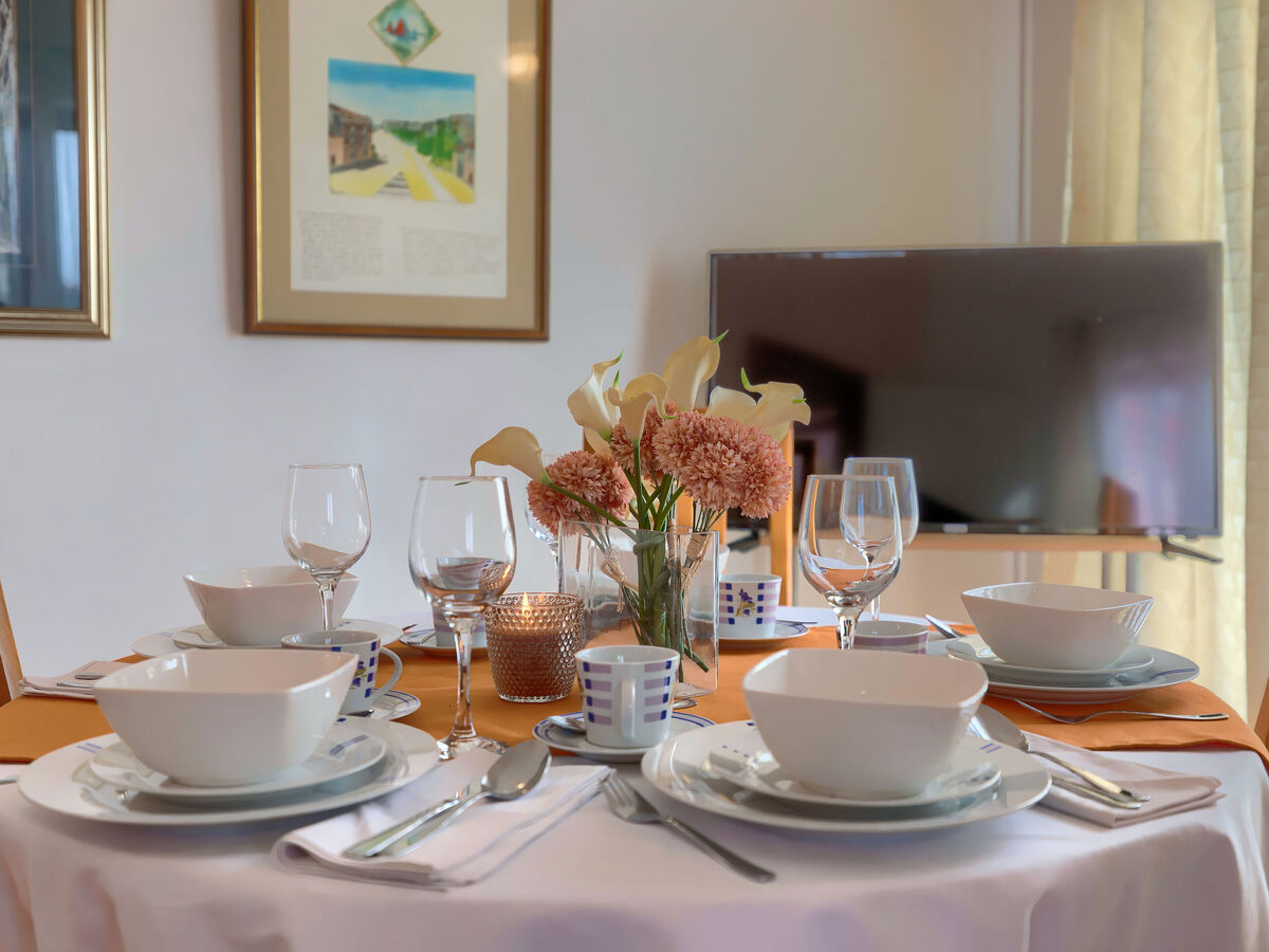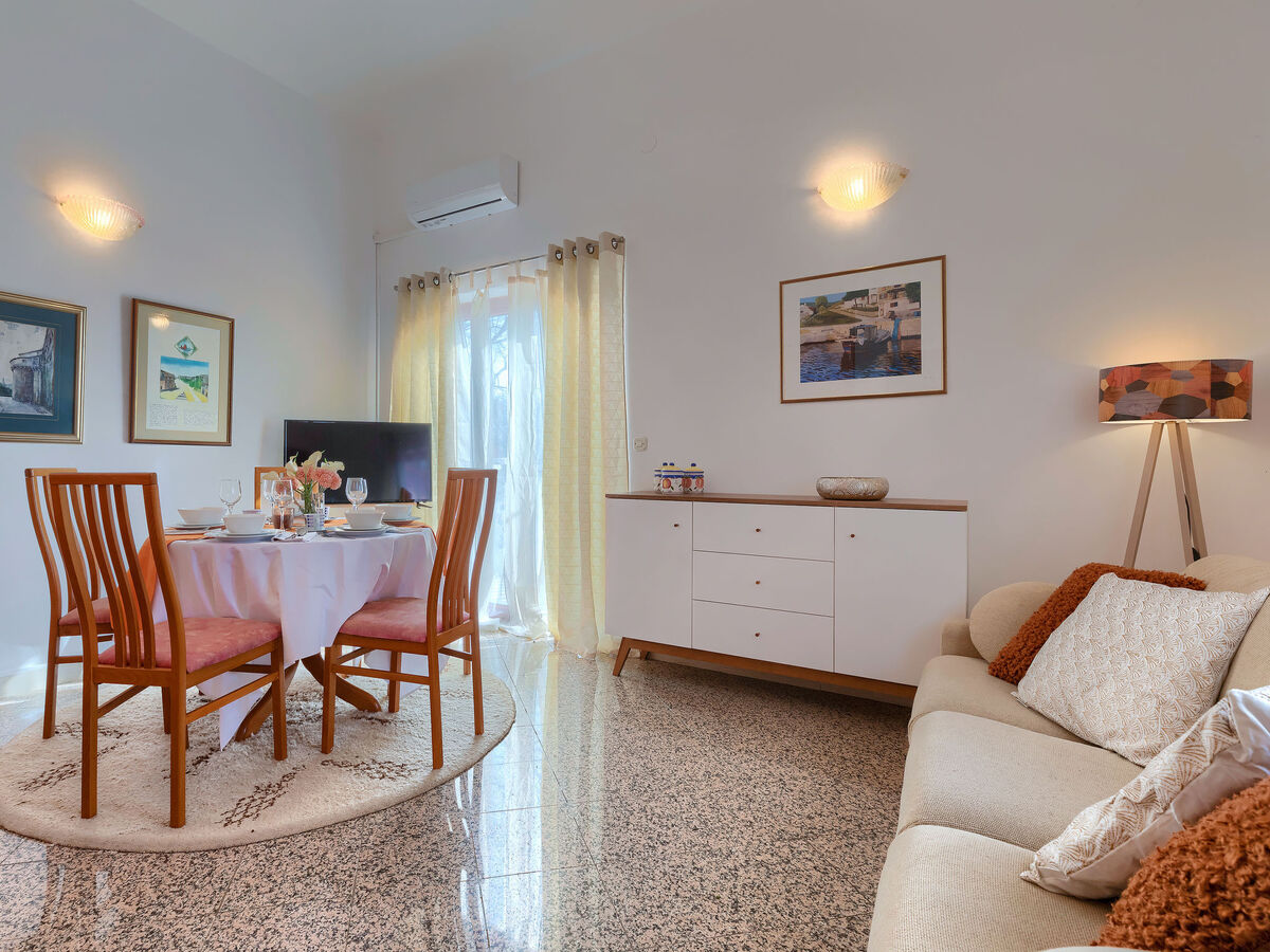 Séjour/salle à manger avec coin-cuisine, TV (satellite) et air-conditionné.