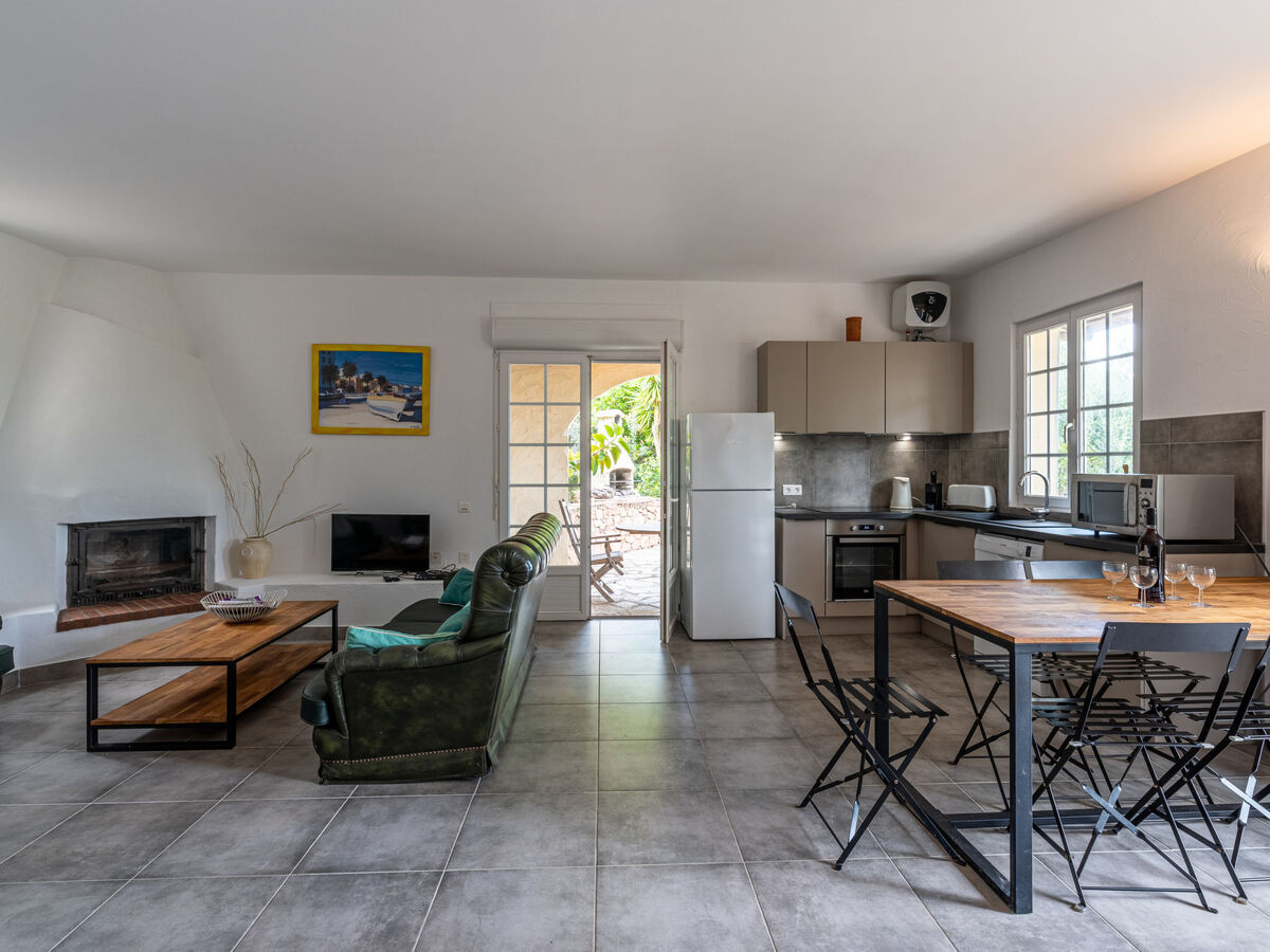 Séjour/salle à manger avec cheminée et TV (écran plat), chaîne stéréo.