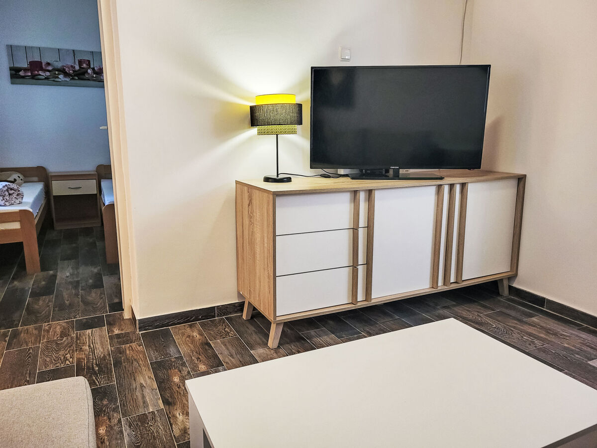 Séjour/salle à manger avec 1 divan-lit double (140 cm, longueur 200 cm), TV.