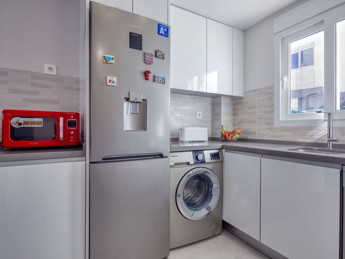 Cuisine ouverte (four, lave-vaisselle, 3 plaques vitrocéramiques, grille-pain, bouilloire électrique, micro-ondes, congélateur, cafetière électrique).