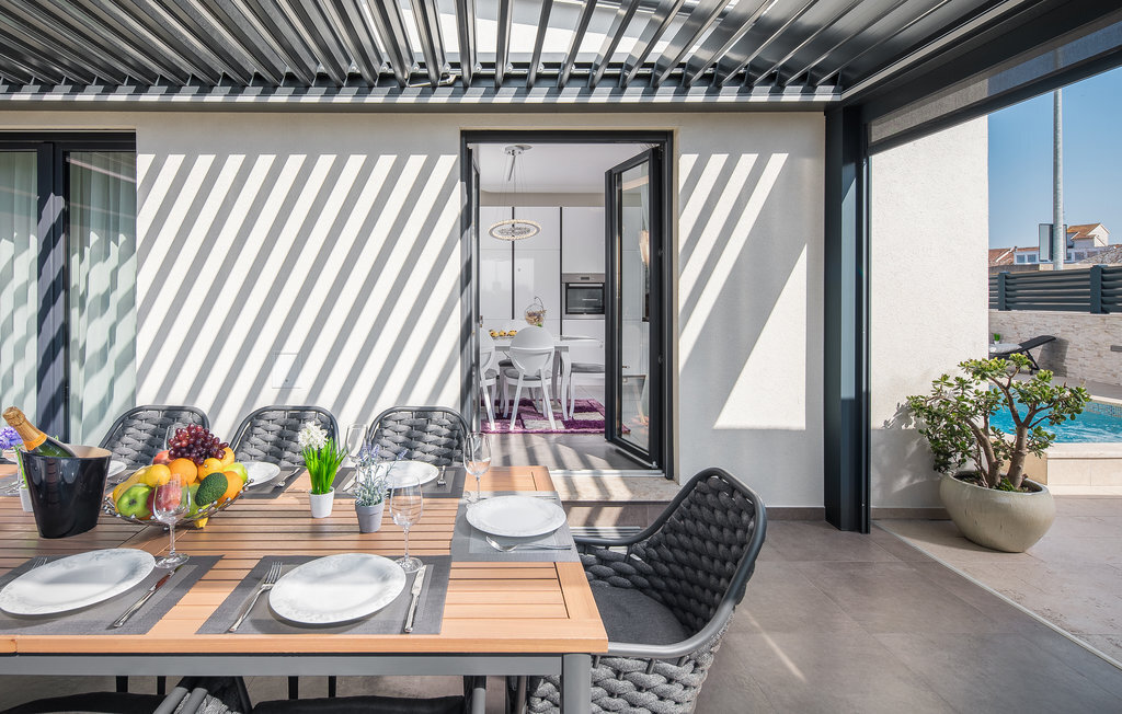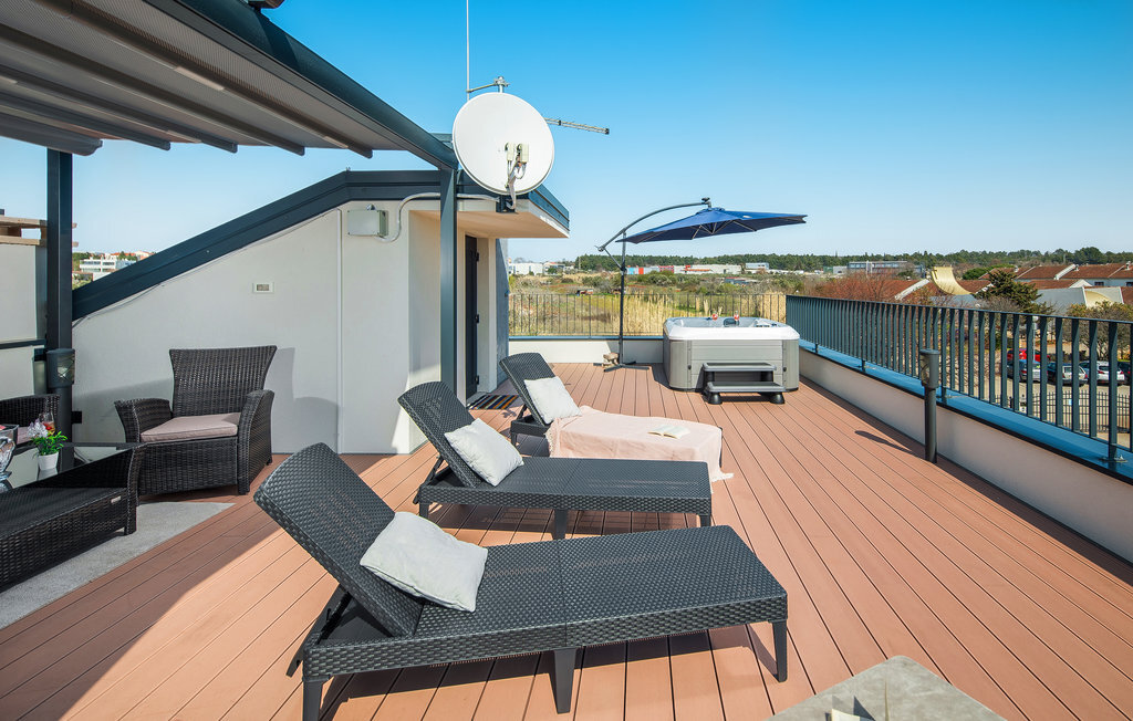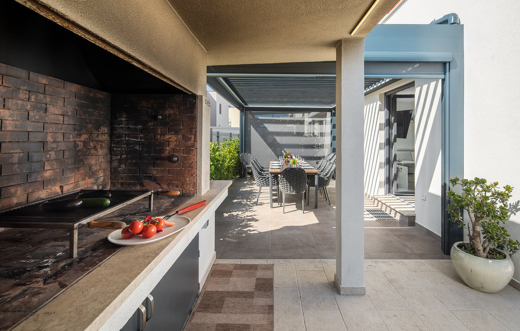 Sur le toit se trouve une terrasse couverte avec un jacuzzi et une vue phénoménale sur la mer. Dans la cour, il y a une piscine avec une terrasse couverte et une cuisine d'été où vous pourrez concocter de bons petits plats.
