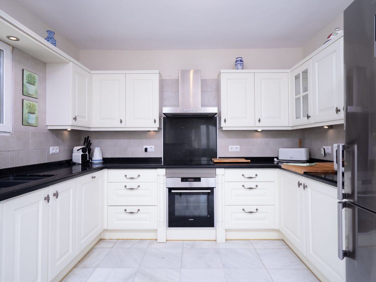 Grande cuisine ouverte (four, lave-vaisselle, 3 plaques à induction, grille-pain, bouilloire électrique, micro-ondes, congélateur, cafetière électrique, Capsules pour machine à café (Krups Nespresso)).