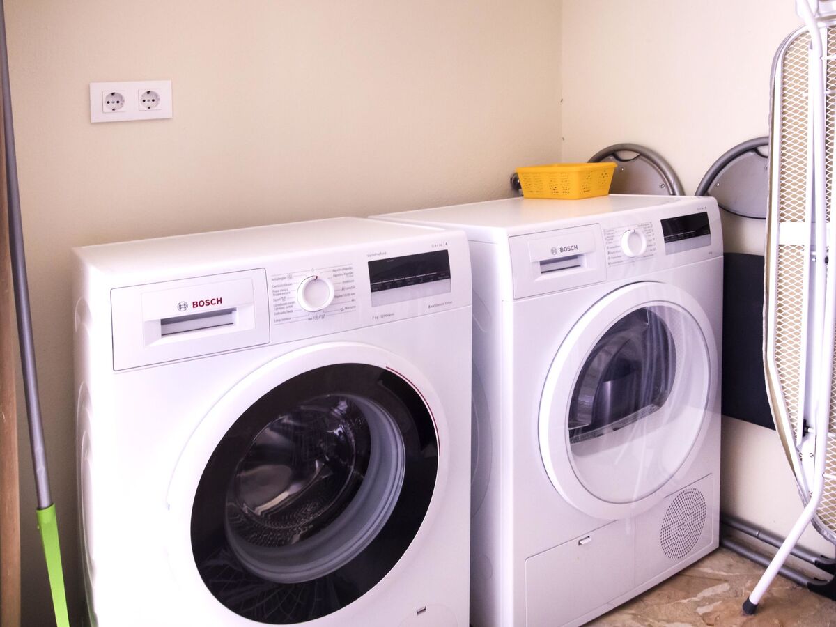 A disposition: lave-linge, sèche-linge, fer à repasser, chaise haute pour enfant, lit bébé, sèche-cheveux.