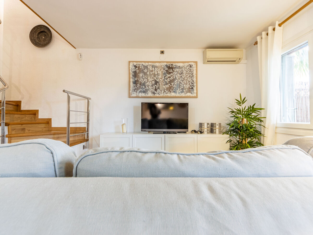 Aménagement simple: séjour/salle à manger avec 1 divan-lit (120 cm, longueur 240 cm), Télévision numérique et air-conditionné.