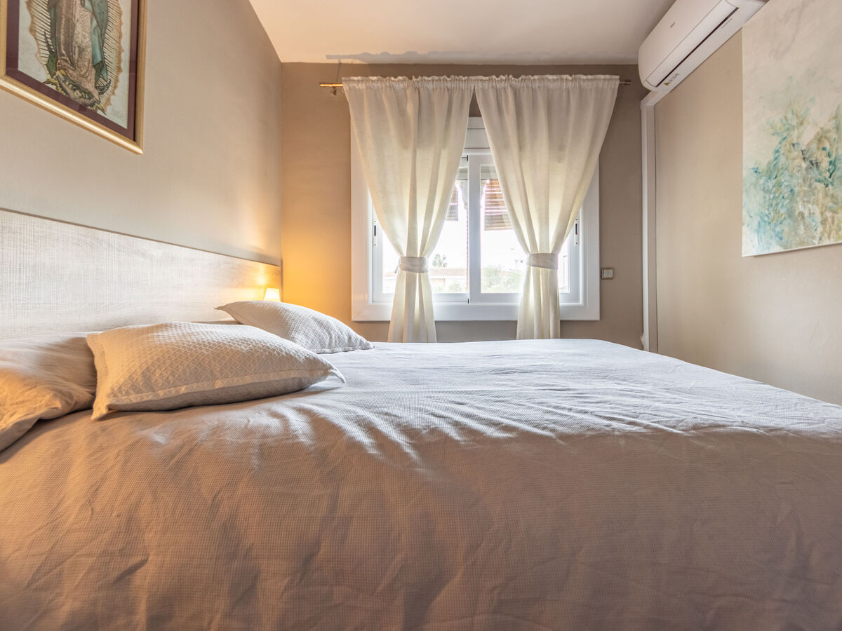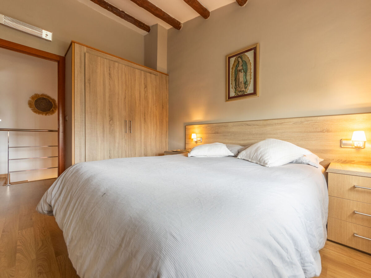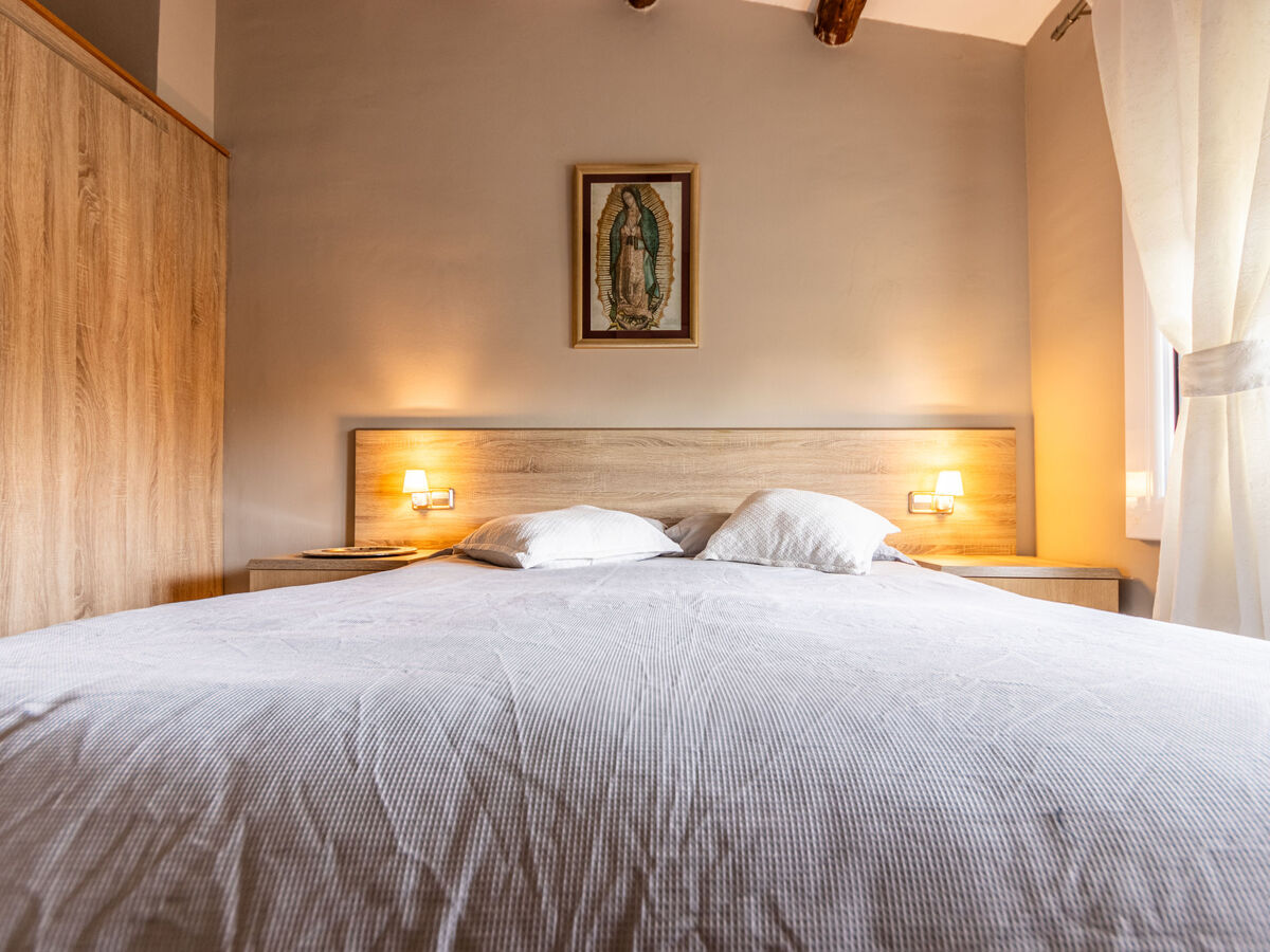 À l'étage supérieur: 1 chambre avec 1 grand-lit (150 cm, longueur 190 cm), radiateur électrique et air-conditionné.