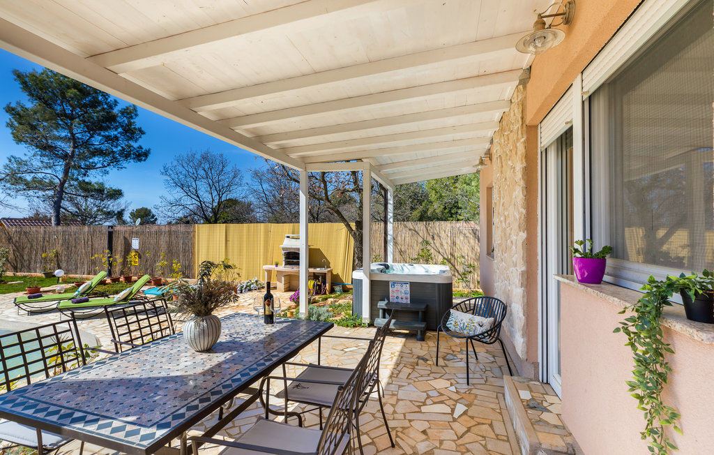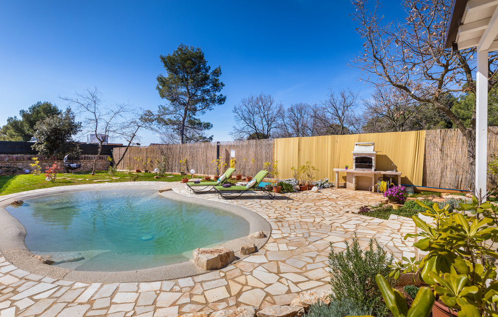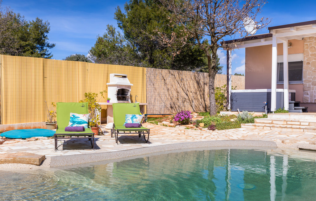 Bien-être à l'extérieur : Location de vacances disposant de chaises-longues et d'un ou plusieurs équipements tels que piscine extérieure, jacuzzi extérieur, lit à baldaquin de jardin etc...