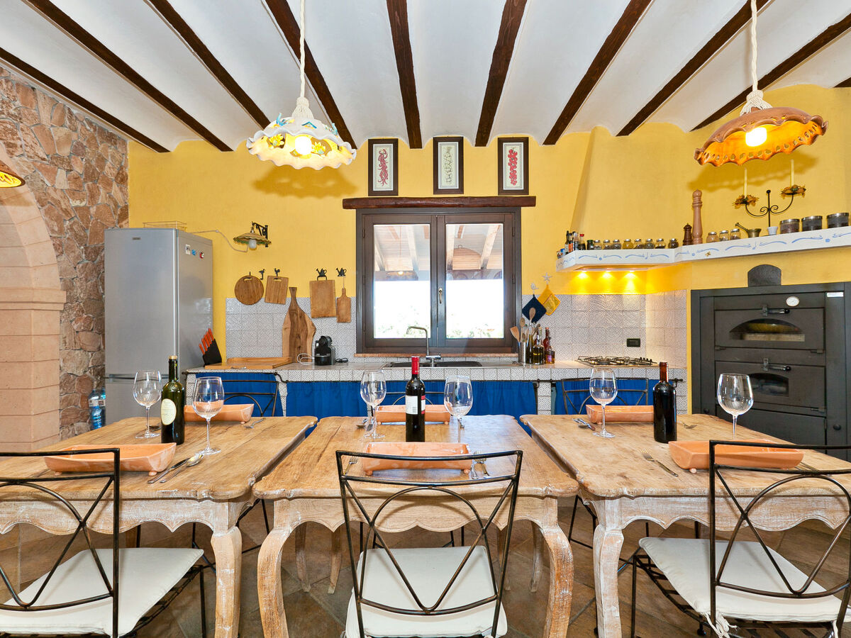 Cuisine (four, lave-vaisselle, 6 feux, grille-pain, bouilloire électrique, micro-ondes, cafetière électrique, four à pizza) avec table pour les repas.