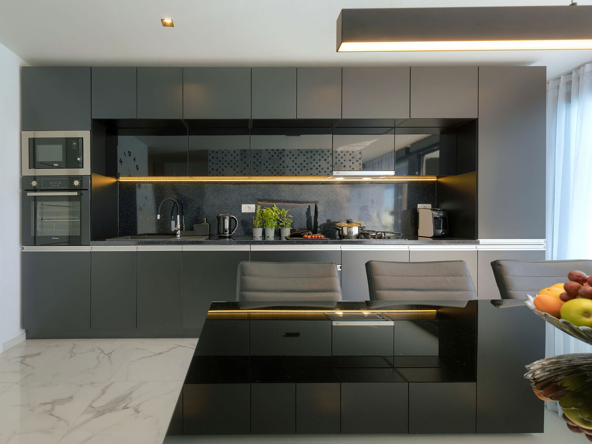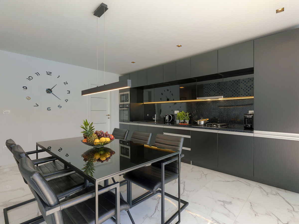 Cuisine ouverte (four, lave-vaisselle, 2 plaques vitrocéramiques, 2 feux, bouilloire électrique, micro-ondes, congélateur, cafetière électrique).