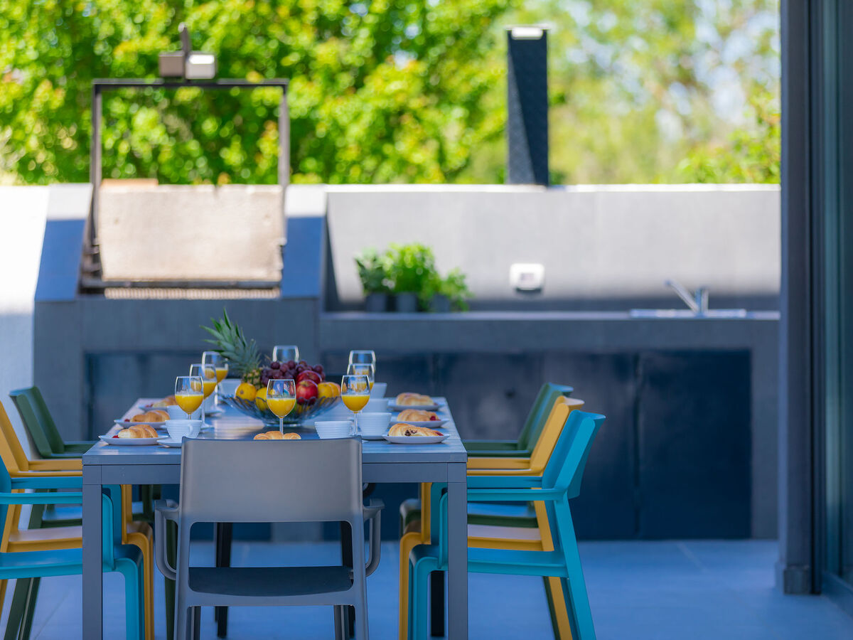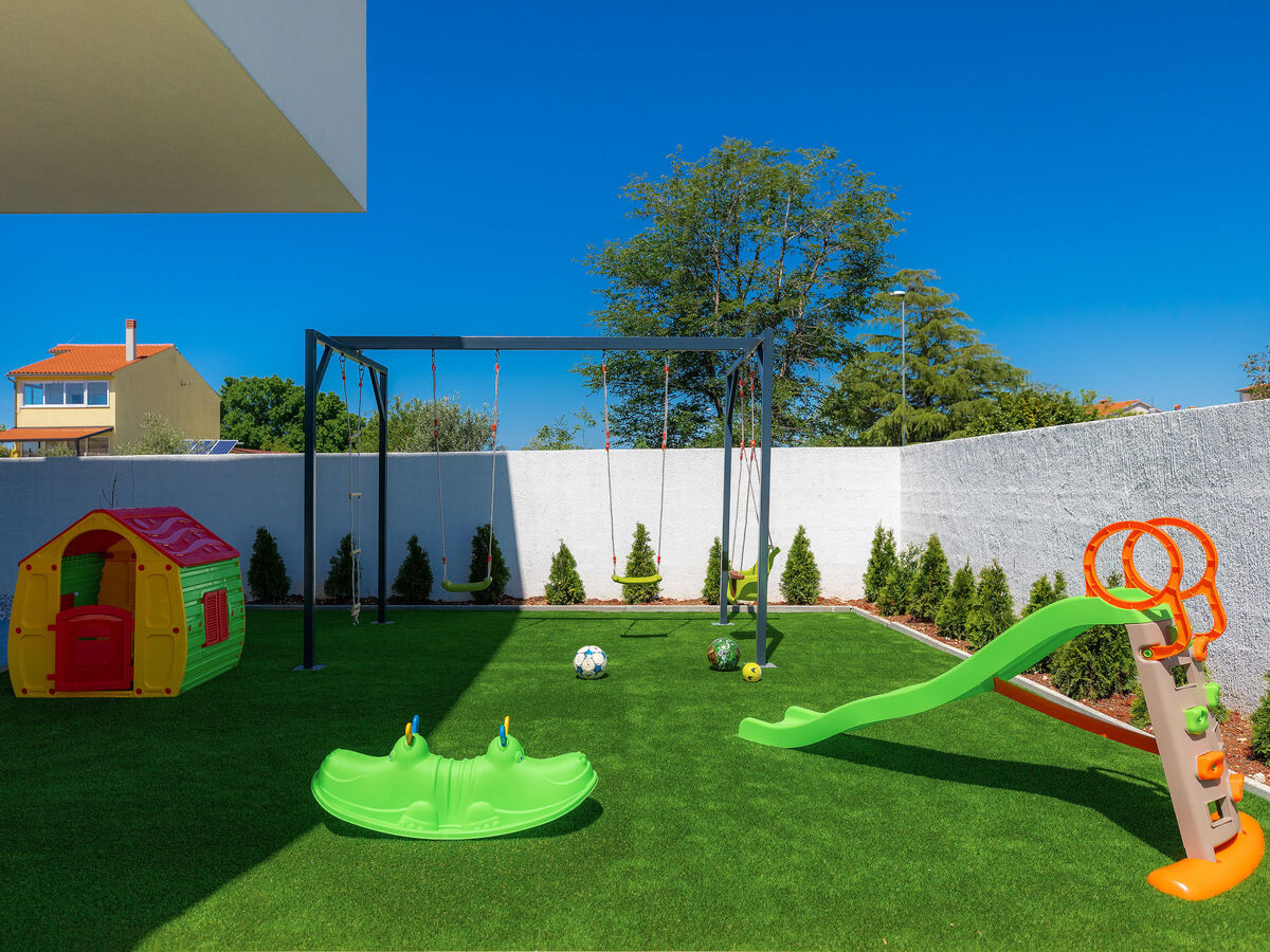 Douche extérieure, terrasse (40 m2), meubles de jardin, barbecue, espace de jeux pour les enfants (toboggan, balançoire).