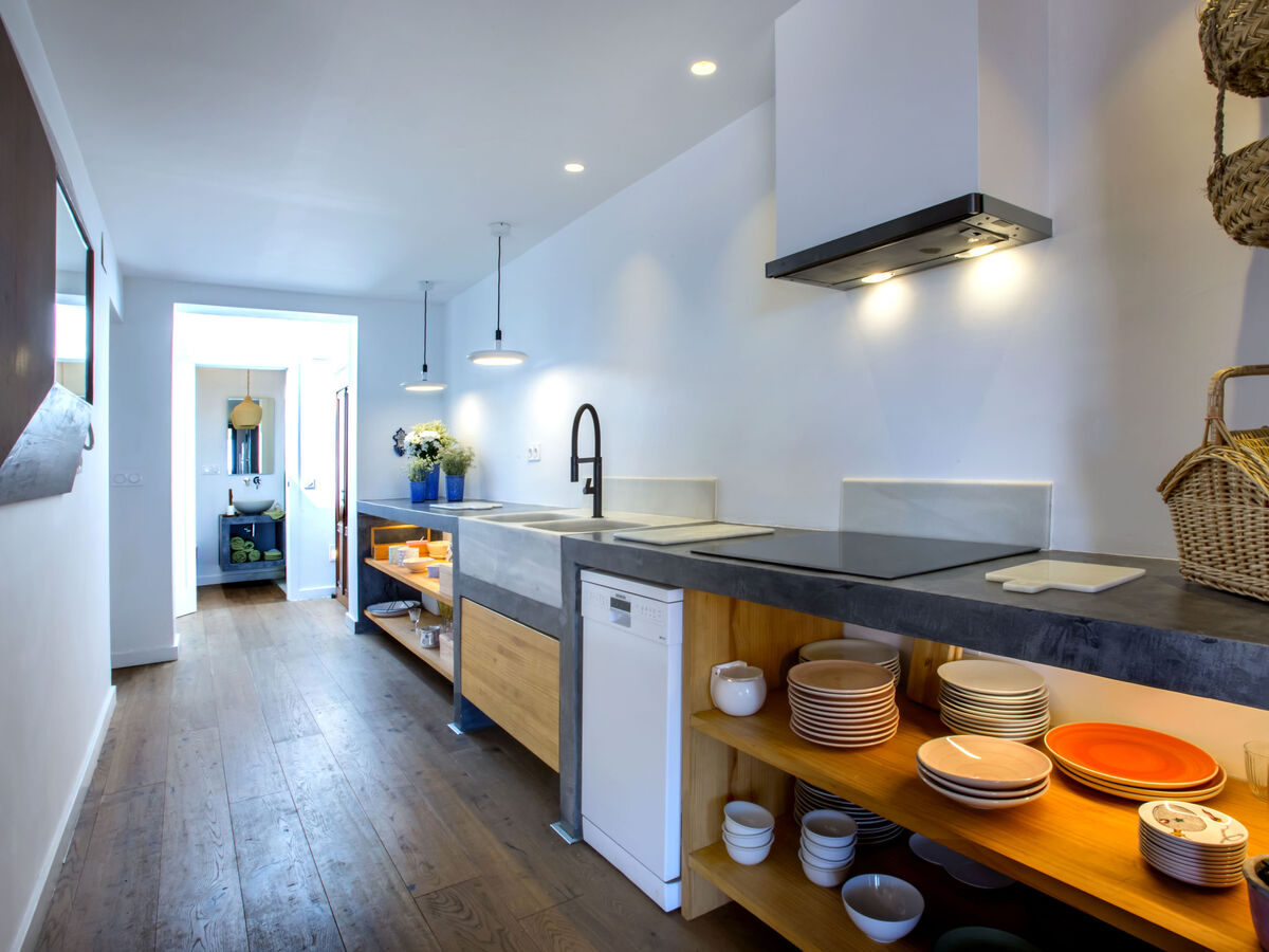Grande cuisine ouverte (2 plaques de cuisson, four, lave-vaisselle, 2 plaques à induction, micro-ondes, congélateur, cafetière électrique).