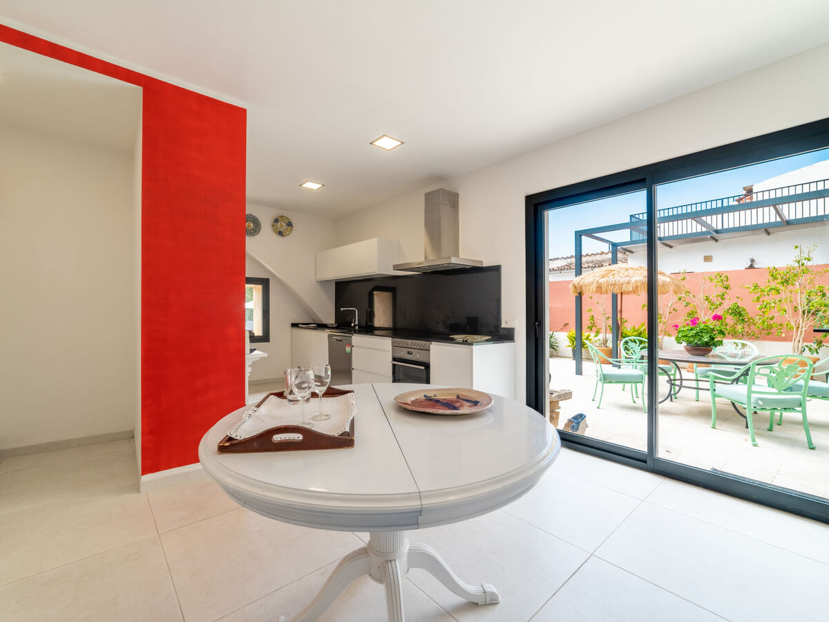 Cuisine ouverte (four, lave-vaisselle, 3 plaques vitrocéramiques, grille-pain, bouilloire électrique, micro-ondes, cafetière électrique) avec petite table pour les repas, coin-cuisine.
