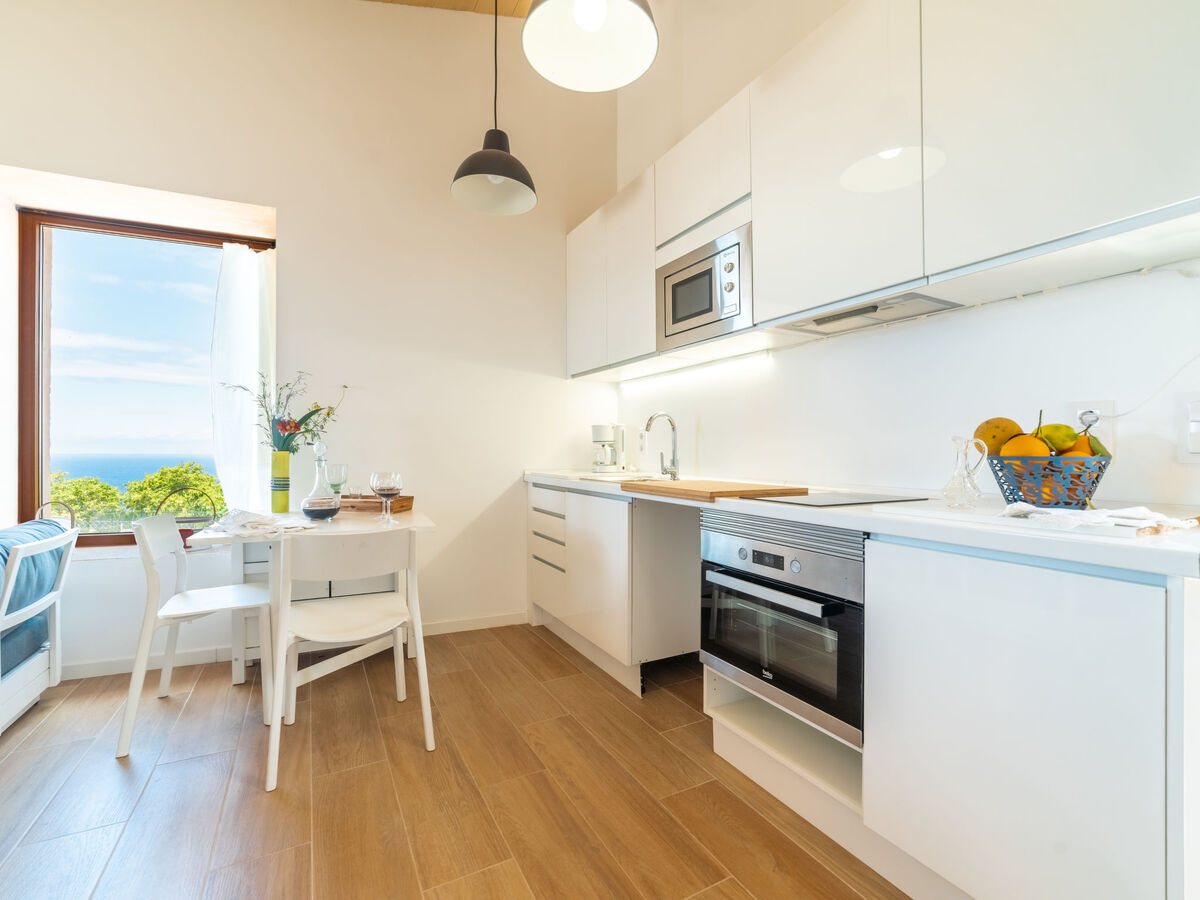 Cuisine ouverte (four, lave-vaisselle, 2 plaques vitrocéramiques, grille-pain, bouilloire électrique, micro-ondes, congélateur, cafetière électrique) avec petite table pour les repas.