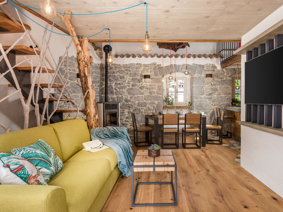 Complètement rénovée en 2021, aménagement agréable et de bon goût: séjour/salle à manger avec 1 divan-lit double (160 cm, longueur 190 cm), TV (satellite).