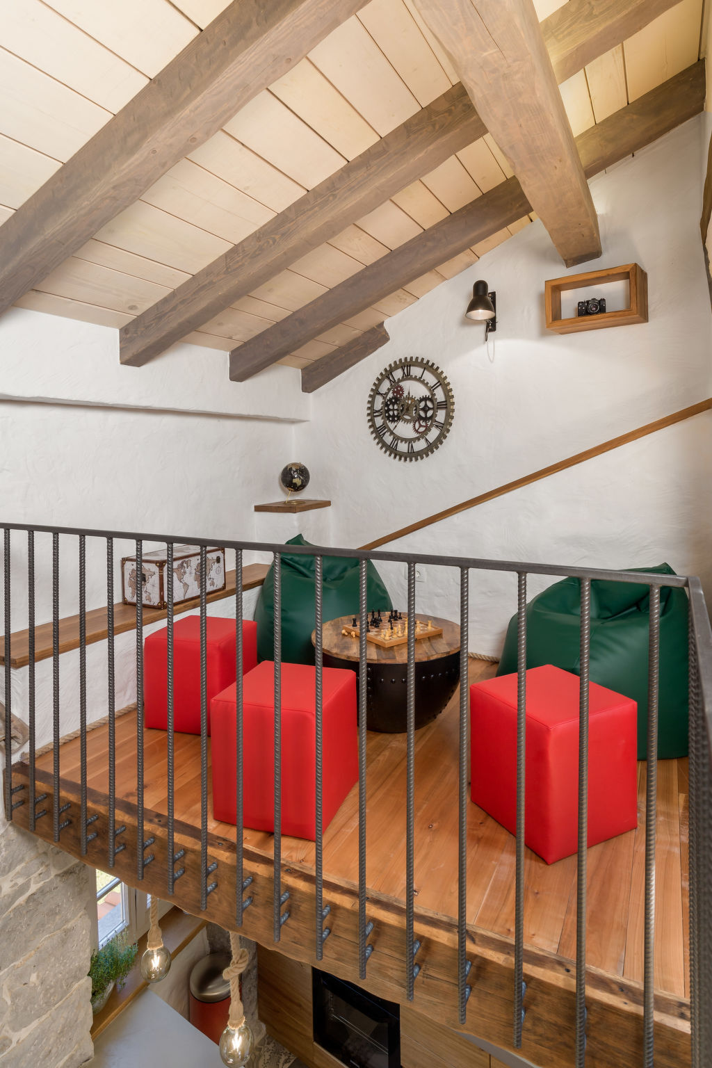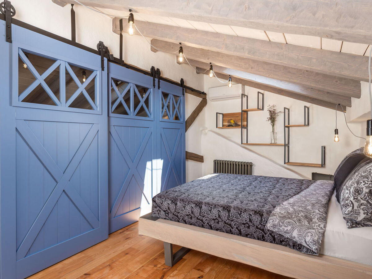 À l'étage supérieur: 1 chambre, mansardée hauteur plafond 160 - 350 cm avec fenêtre sous le toit avec 1 grand-lit (160 cm, longueur 190 cm), air-conditionné.