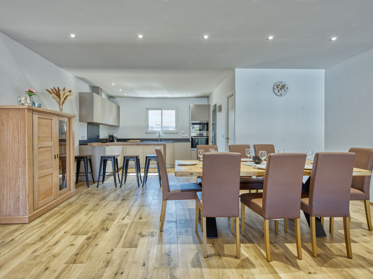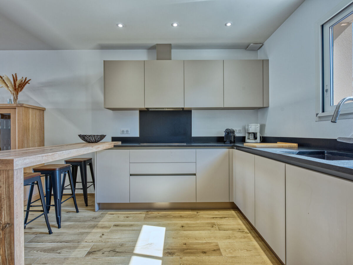 Cuisine ouverte (four, lave-vaisselle, 4 plaques à induction, grille-pain, bouilloire électrique, micro-ondes, congélateur, cafetière électrique, Capsules pour machine à café (Nespresso) (NON INCLUSES)) avec bar, table pour les repas.