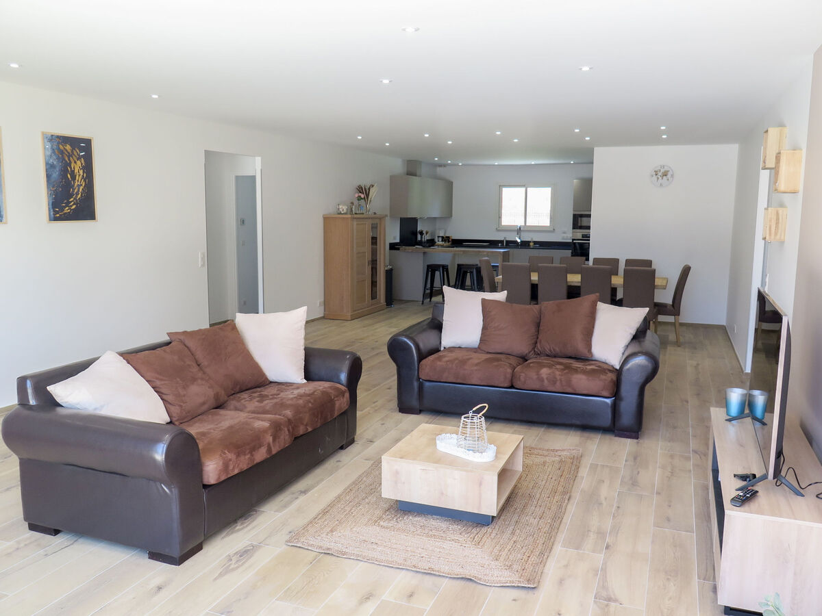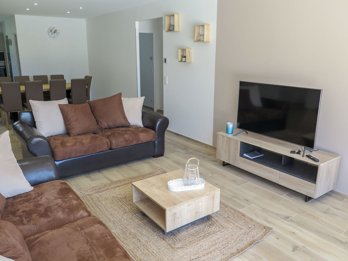 Clair, aménagement confortable et de bon goût: grand séjour/salle à manger avec table pour les repas et TV (satellite) (écran plat).