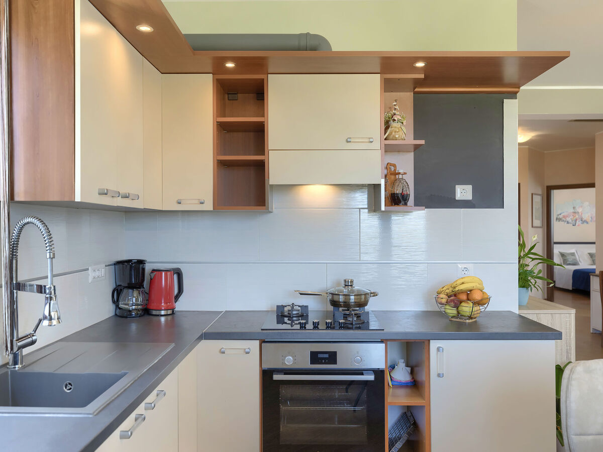 Cuisine ouverte (1 plaque de cuisson, four, lave-vaisselle, 3 feux, bouilloire électrique, congélateur, cafetière électrique).